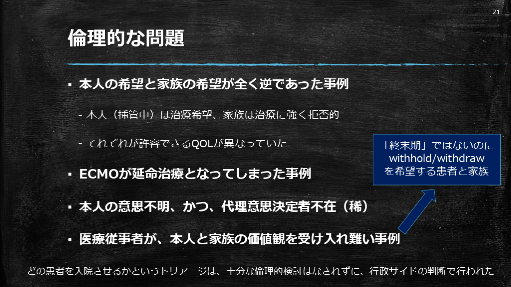 医療従事者が、本人と家族の価値観を受け入れ難い事例 21 どの患者を入院させるかというトリアージは、十分な倫理的検討はなされずに、行政サイドの判断で行われた 「終末期」ではないのに