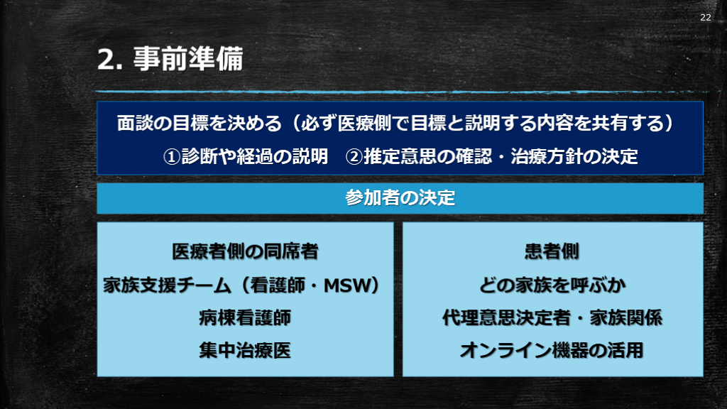#22. 2. 事前準備 22 面談の目標を決める(必ず医療側で目標と説明する内容を共有する)