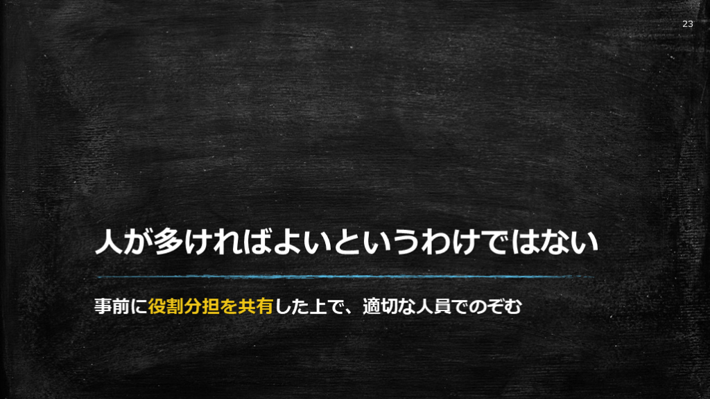 #23. 人が多ければよいというわけではない 事前に役割分担を共有した上で、適切な人員でのぞむ 23