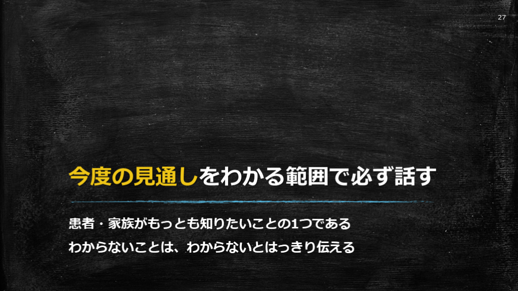#27. 今度の見通しをわかる範囲で必ず話す 患者・家族がもっとも知りたいことの1つである