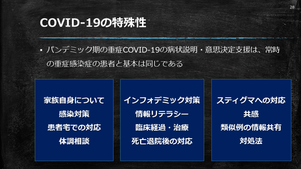 #28. COVID-19の特殊性 パンデミック期の重症COVID-19の病状説明・意思決定支援は、常時の重症感染症の患者と基本は同じである 28 家族自身について