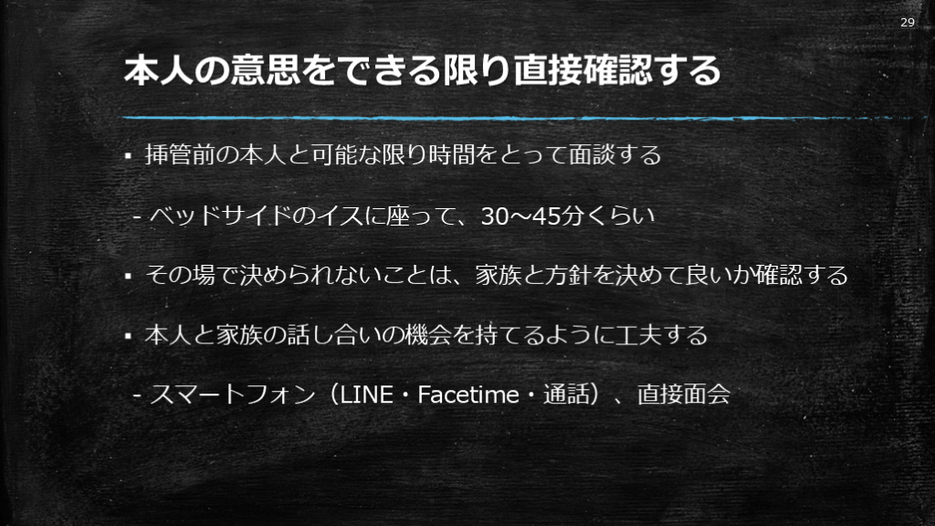 #29. 本人の意思をできる限り直接確認する 挿管前の本人と可能な限り時間をとって面談する