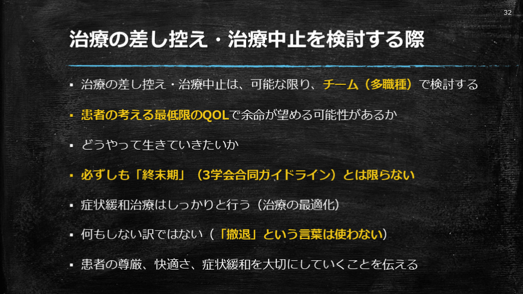 #32. 治療の差し控え・治療中止を検討する際 治療の差し控え・治療中止は、可能な限り、チーム(多職種)で検討する