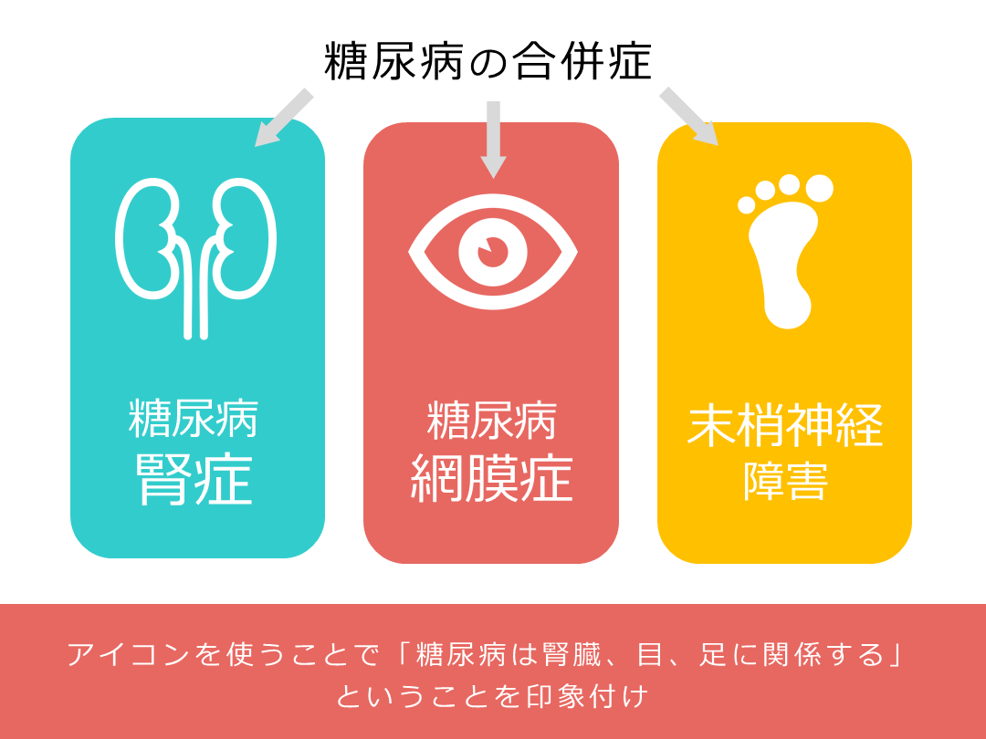 #33. アイコンを使うことで「糖尿病は腎臓、目、足に関係する」