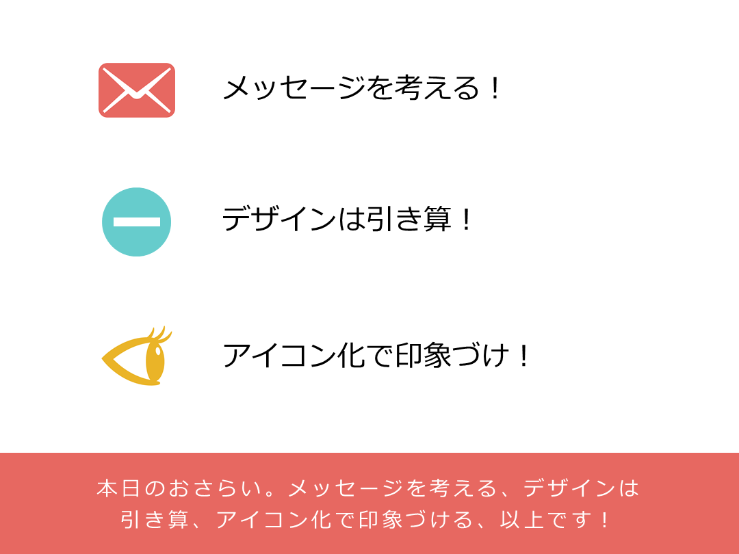 引き算、アイコン化で印象づける、以上です! メッセージを考える! デザインは引き算! アイコン化で印象づけ!