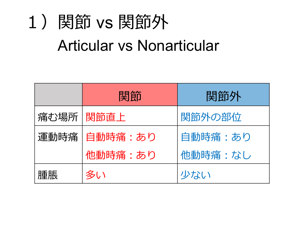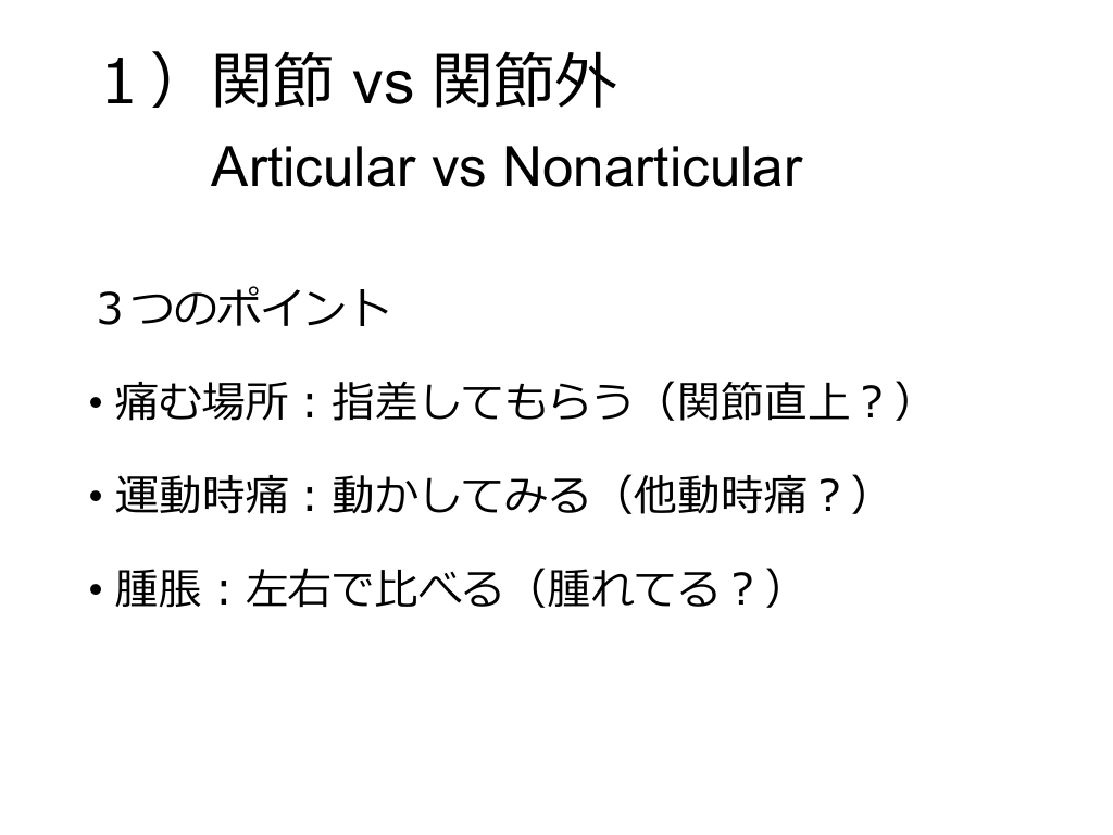 #14. 1)関節 vs 関節外 Articular vs Nonarticular 3つのポイント • 痛む場所:指差してもらう(関節直上?) • 運動時痛:動かしてみる(他動時痛?) • 腫脹:左右で比べる(腫れてる?)