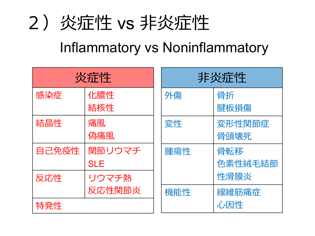 #18. 2)炎症性 vs 非炎症性 Inflammatory vs Noninflammatory 炎症性 非炎症性 感染症 化膿性 結核性 外傷 骨折 腱板損傷 結晶性 痛風 偽痛風 変性 変形性関節症 骨頭壊死 腫瘍性 骨転移 色素性絨毛結節 性滑膜炎 機能性 線維筋痛症 心因性 自己免疫性 関節リウマチ SLE 反応性 特発性 リウマチ熱 反応性関節炎