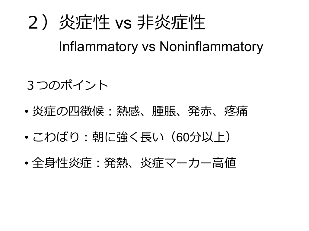 #19. 2)炎症性 vs 非炎症性 Inflammatory vs Noninflammatory 3つのポイント • 炎症の四徴候:熱感、腫脹、発赤、疼痛 • こわばり:朝に強く長い(60分以上) • 全身性炎症:発熱、炎症マーカー高値