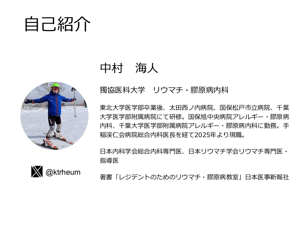 #2. 自己紹介 中村 海人 獨協医科大学 リウマチ・膠原病内科 東北大学医学部卒業後、太田西ノ内病院、国保松戸市立病院、千葉 大学医学部附属病院にて研修。国保旭中央病院アレルギー・膠原病 内科、千葉大学医学部附属病院アレルギー・膠原病内科に勤務。手 稲渓仁会病院総合内科医長を経て2025年より現職。 日本内科学会総合内科専門医、日本リウマチ学会リウマチ専門医・ 指導医 @ktrheum 著書「レジデントのためのリウマチ・膠原病教室」日本医事新報社