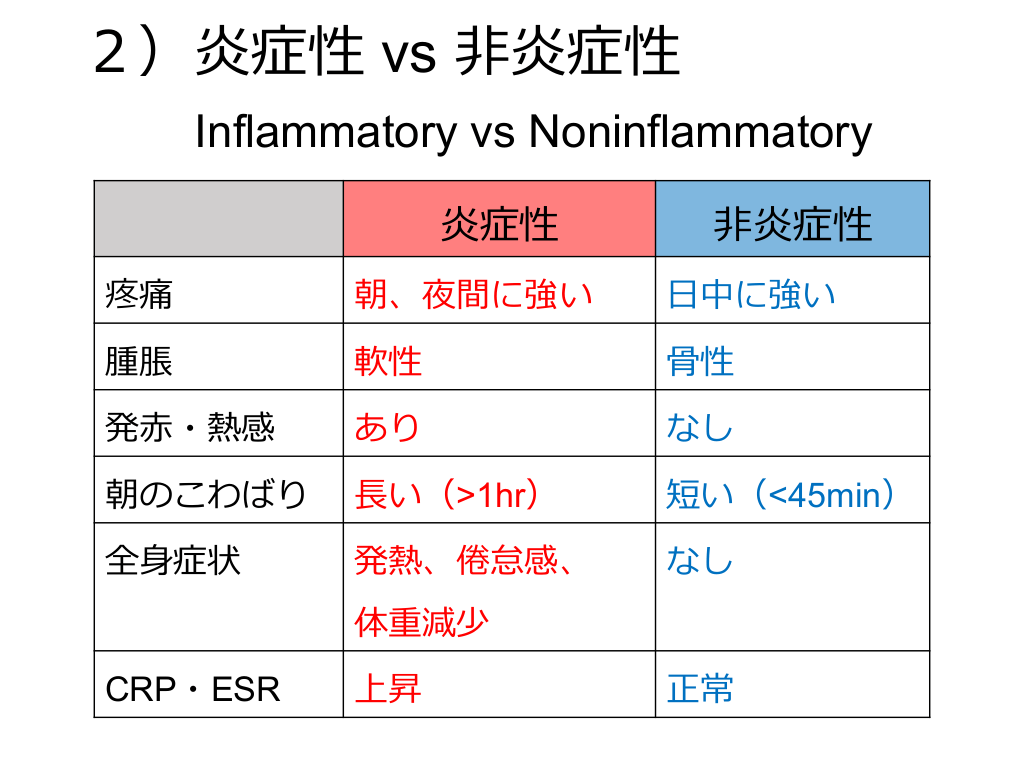 #20. 2)炎症性 vs 非炎症性 Inflammatory vs Noninflammatory 炎症性 非炎症性 疼痛 朝、夜間に強い 日中に強い 腫脹 軟性 骨性 発赤・熱感 あり なし 朝のこわばり 長い(>1hr) 短い(<45min) 全身症状 発熱、倦怠感、 なし 体重減少 CRP・ESR 上昇 正常
