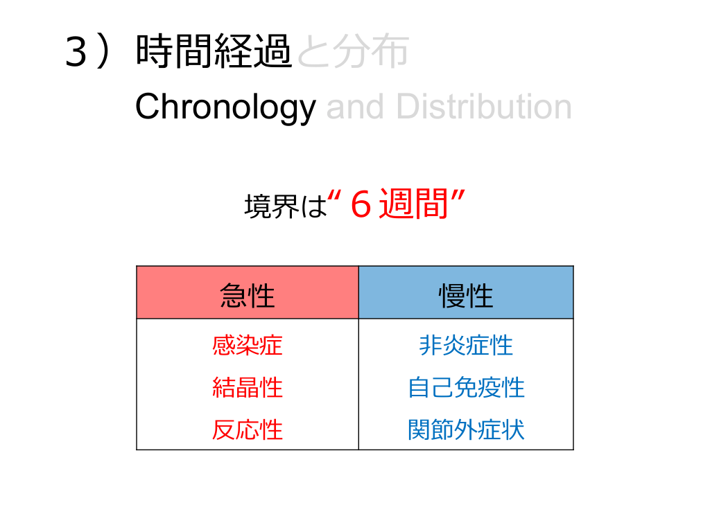 #22. 3)時間経過と分布 Chronology and Distribution 境界は“6週間” 急性 慢性 感染症 非炎症性 結晶性 自己免疫性 反応性 関節外症状
