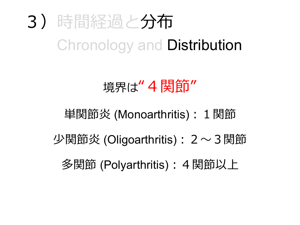 #23. 3)時間経過と分布 Chronology and Distribution 境界は“4関節” 単関節炎 (Monoarthritis):1関節 少関節炎 (Oligoarthritis):2~3関節 多関節 (Polyarthritis):4関節以上