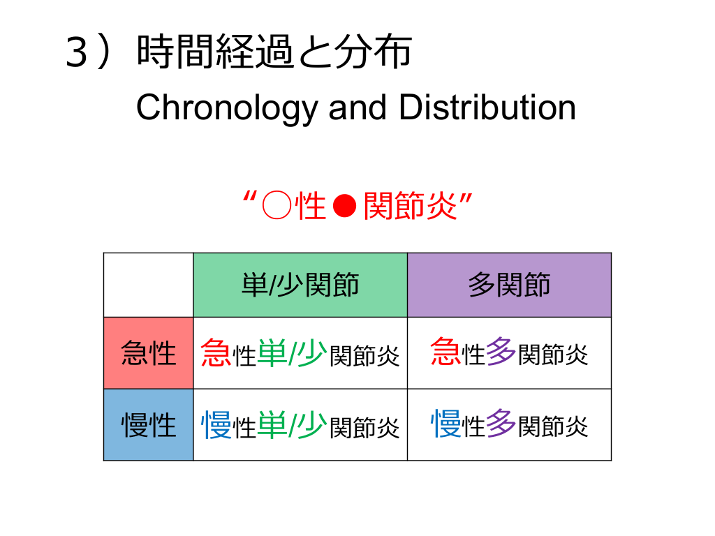 #24. 3)時間経過と分布 Chronology and Distribution “○性●関節炎” 単/少関節 多関節 急性 急性単/少関節炎 急性多関節炎 慢性 慢性単/少関節炎 慢性多関節炎