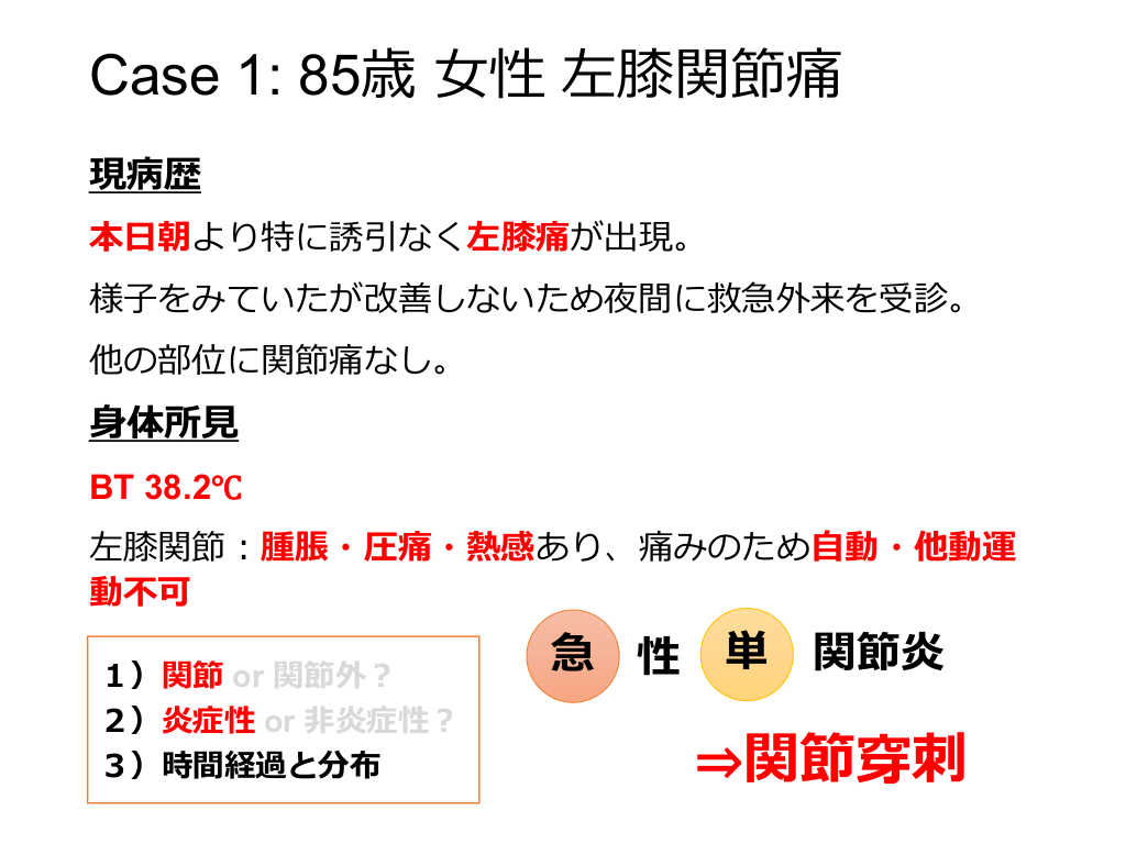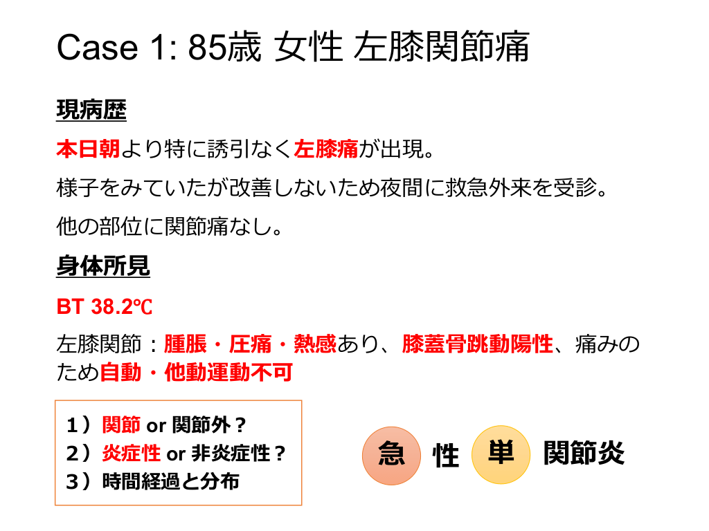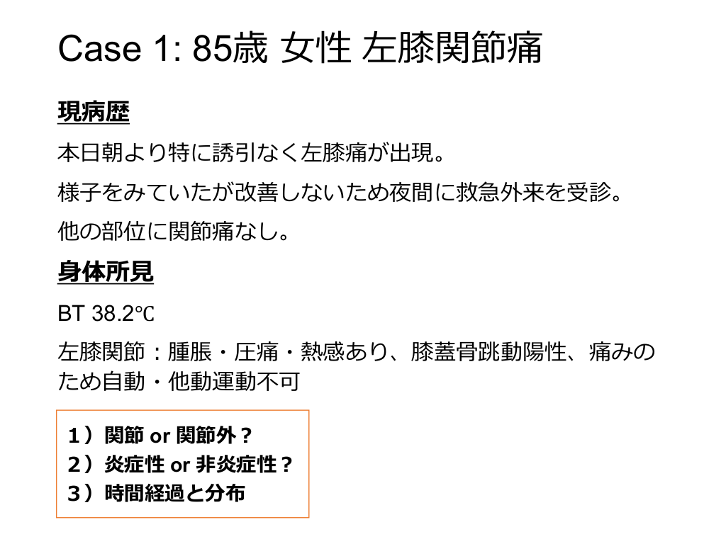 #26. Case 1: 85歳 女性 左膝関節痛 現病歴 本日朝より特に誘引なく左膝痛が出現。 様子をみていたが改善しないため夜間に救急外来を受診。 他の部位に関節痛なし。 身体所見 BT 38.2℃ 左膝関節:腫脹・圧痛・熱感あり、膝蓋骨跳動陽性、痛みの ため自動・他動運動不可 1)関節 or 関節外? 2)炎症性 or 非炎症性? 3)時間経過と分布