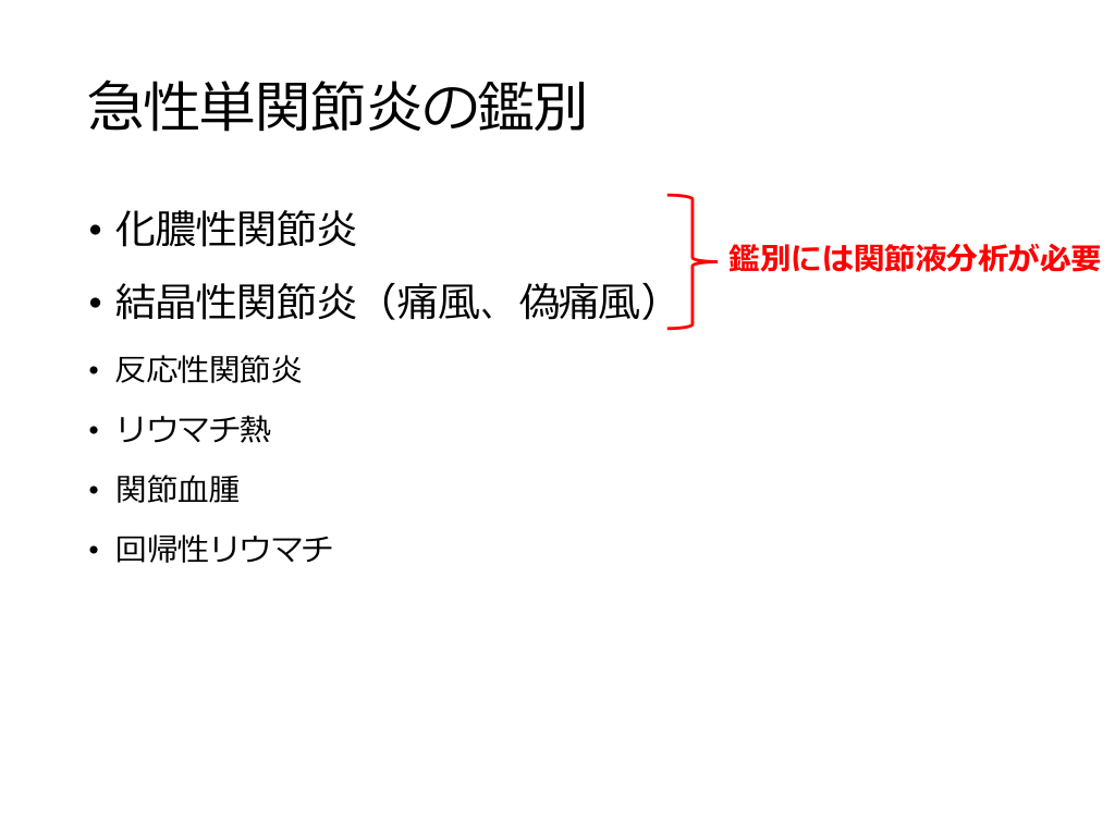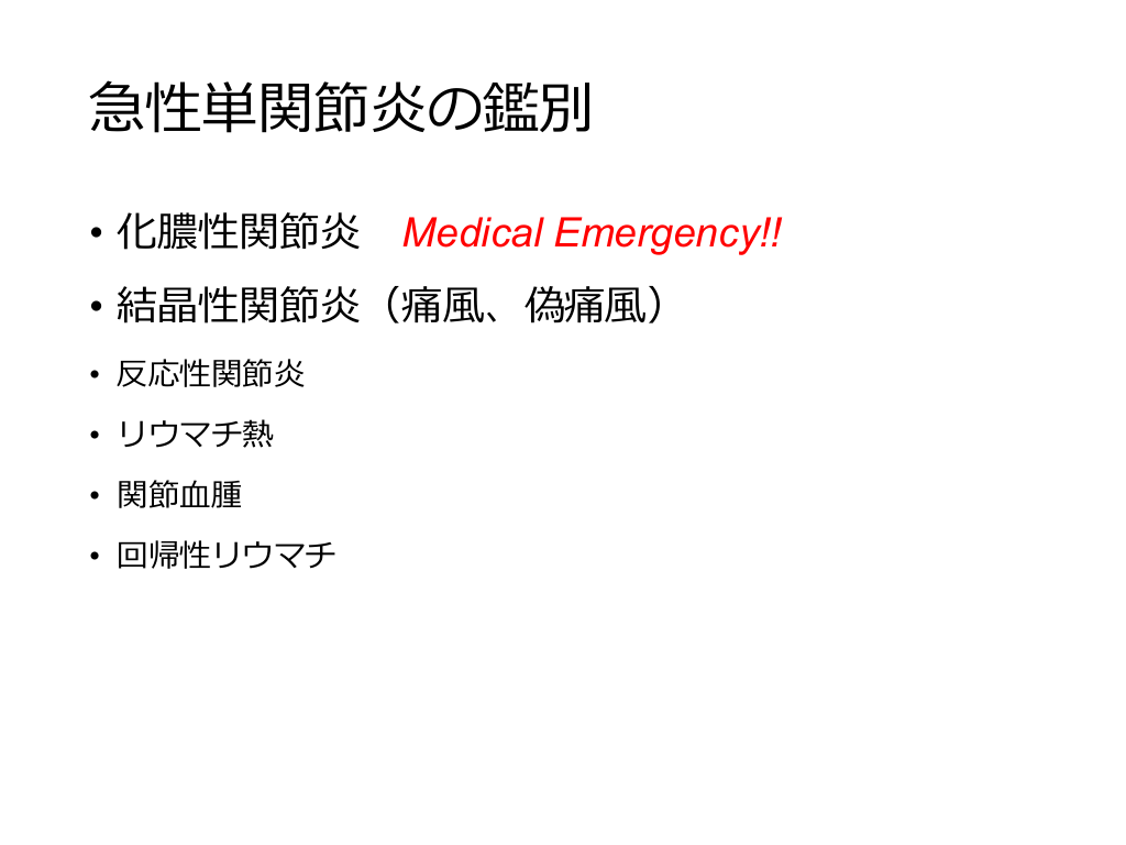 #28. 急性単関節炎の鑑別 • 化膿性関節炎 Medical Emergency!! • 結晶性関節炎(痛風、偽痛風) • 反応性関節炎 • リウマチ熱 • 関節血腫 • 回帰性リウマチ