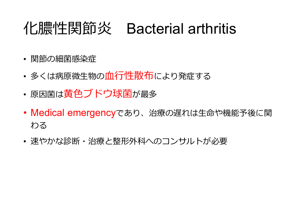 #29. 化膿性関節炎 Bacterial arthritis • 関節の細菌感染症 • 多くは病原微生物の血行性散布により発症する • 原因菌は黄色ブドウ球菌が最多 • Medical emergencyであり、治療の遅れは生命や機能予後に関 わる • 速やかな診断・治療と整形外科へのコンサルトが必要