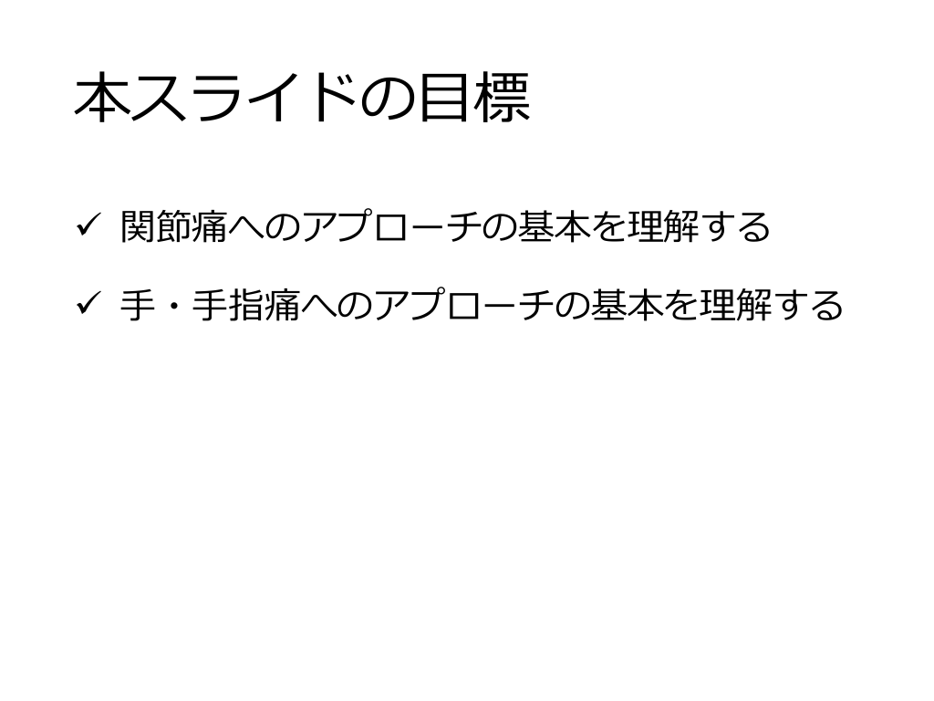 #3. 本スライドの目標 ✓ 関節痛へのアプローチの基本を理解する ✓ 手・手指痛へのアプローチの基本を理解する