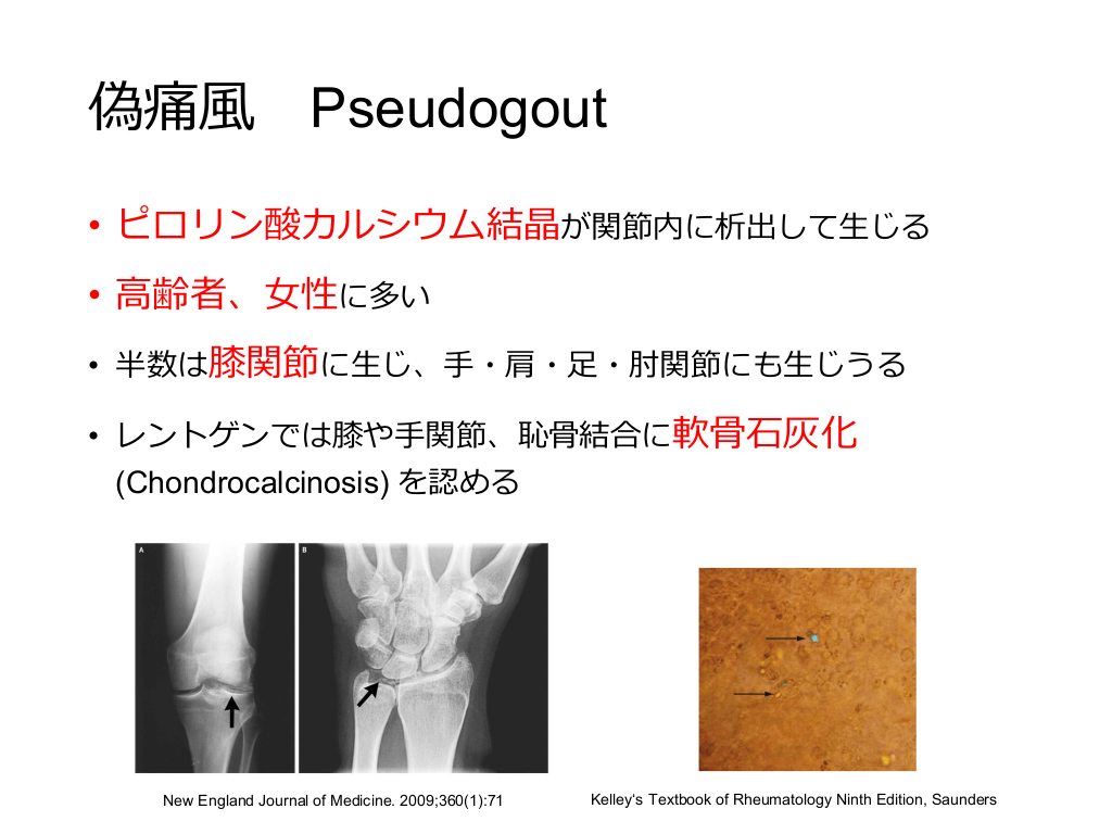 #31. 偽痛風 Pseudogout • ピロリン酸カルシウム結晶が関節内に析出して生じる • 高齢者、女性に多い • 半数は膝関節に生じ、手・肩・足・肘関節にも生じうる • レントゲンでは膝や手関節、恥骨結合に軟骨石灰化 (Chondrocalcinosis) を認める New England Journal of Medicine. 2009;360(1):71 Kelley‘s Textbook of Rheumatology Ninth Edition, Saunders
