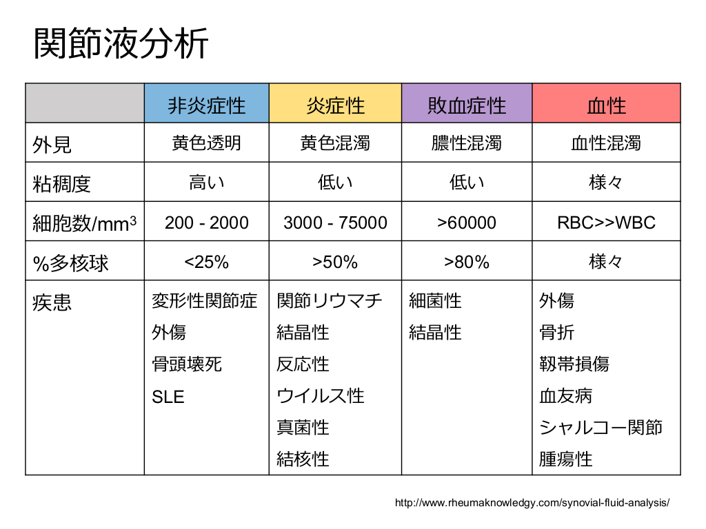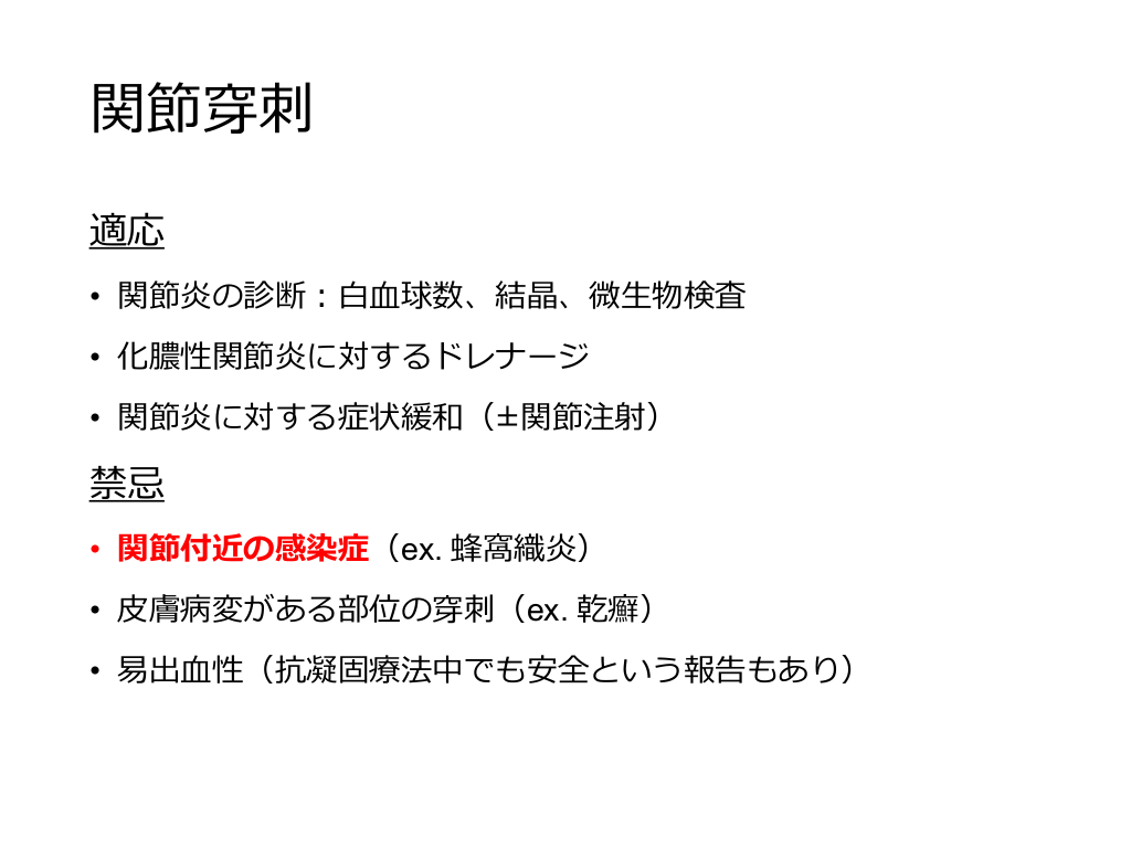 #33. 関節穿刺 適応 • 関節炎の診断:白血球数、結晶、微生物検査 • 化膿性関節炎に対するドレナージ • 関節炎に対する症状緩和(±関節注射) 禁忌 • 関節付近の感染症(ex. 蜂窩織炎) • 皮膚病変がある部位の穿刺(ex. 乾癬) • 易出血性(抗凝固療法中でも安全という報告もあり)