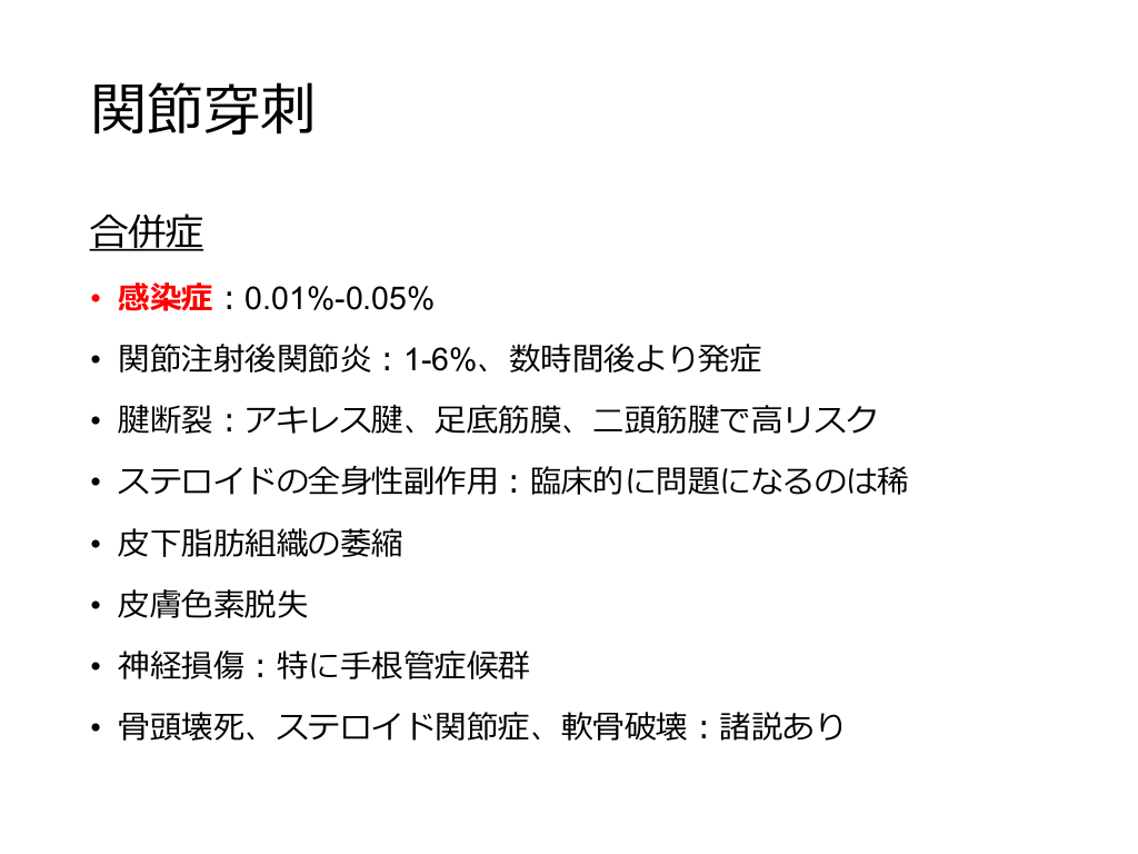 #34. 関節穿刺 合併症 • 感染症:0.01%-0.05% • 関節注射後関節炎:1-6%、数時間後より発症 • 腱断裂:アキレス腱、足底筋膜、二頭筋腱で高リスク • ステロイドの全身性副作用:臨床的に問題になるのは稀 • 皮下脂肪組織の萎縮 • 皮膚色素脱失 • 神経損傷:特に手根管症候群 • 骨頭壊死、ステロイド関節症、軟骨破壊:諸説あり