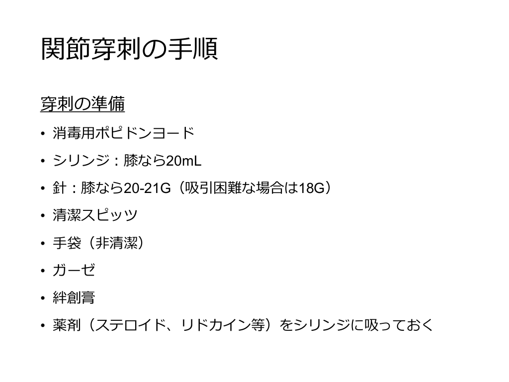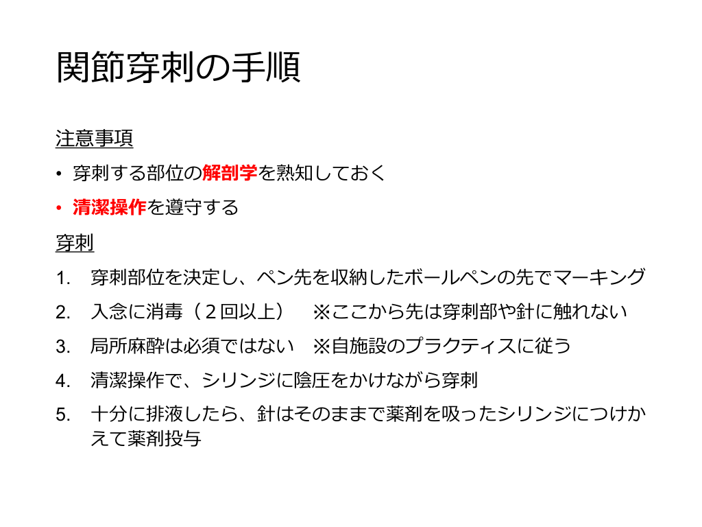 #37. 関節穿刺の手順 注意事項 • 穿刺する部位の解剖学を熟知しておく • 清潔操作を遵守する 穿刺 1. 穿刺部位を決定し、ペン先を収納したボールペンの先でマーキング 2. 入念に消毒(2回以上) ※ここから先は穿刺部や針に触れない 3. 局所麻酔は必須ではない ※自施設のプラクティスに従う 4. 清潔操作で、シリンジに陰圧をかけながら穿刺 5. 十分に排液したら、針はそのままで薬剤を吸ったシリンジにつけか えて薬剤投与