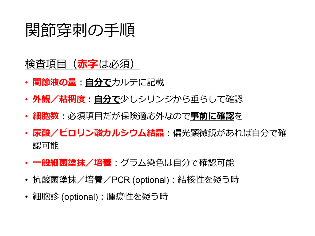 #36. 関節穿刺の手順 検査項目(赤字は必須) • 関節液の量:自分でカルテに記載 • 外観/粘稠度:自分で少しシリンジから垂らして確認 • 細胞数:必須項目だが保険適応外なので事前に確認を • 尿酸/ピロリン酸カルシウム結晶:偏光顕微鏡があれば自分で確 認可能 • 一般細菌塗抹/培養:グラム染色は自分で確認可能 • 抗酸菌塗抹/培養/PCR (optional):結核性を疑う時 • 細胞診 (optional):腫瘍性を疑う時