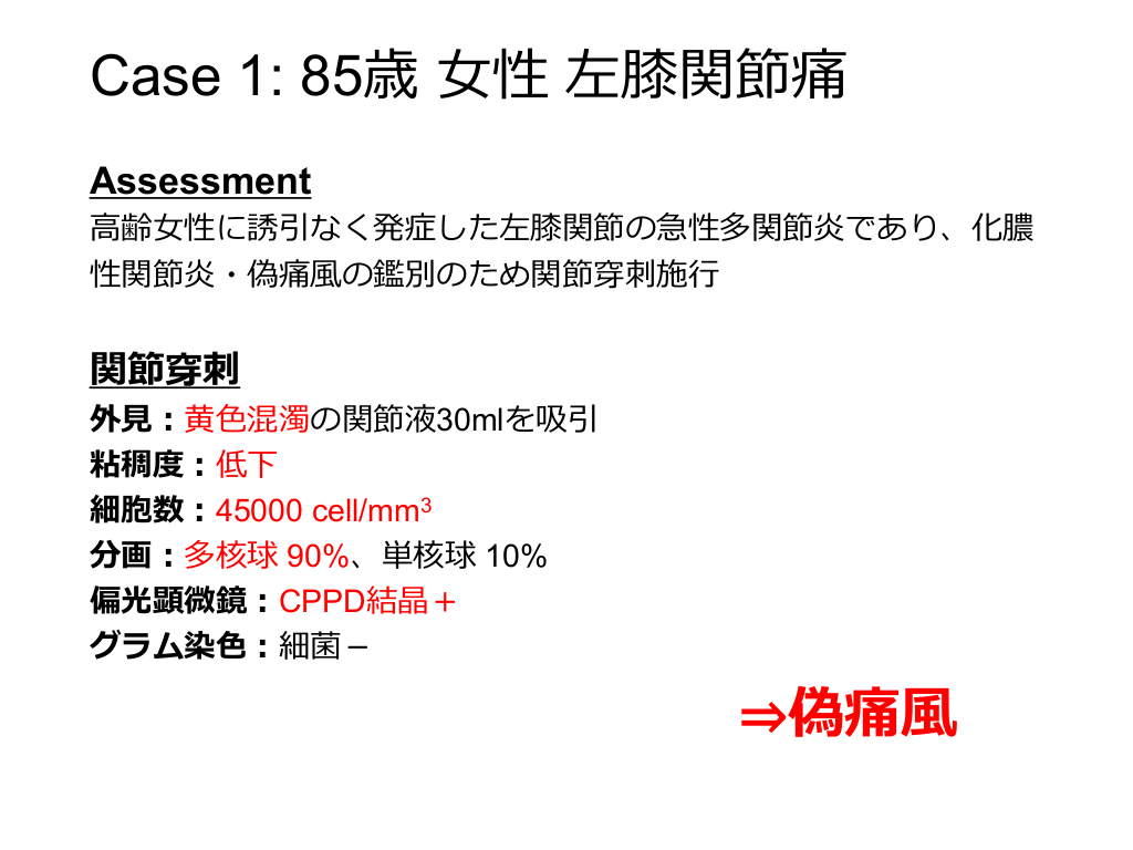 #40. Case 1: 85歳 女性 左膝関節痛 Assessment 高齢女性に誘引なく発症した左膝関節の急性多関節炎であり、化膿 性関節炎・偽痛風の鑑別のため関節穿刺施行 関節穿刺 外見:黄色混濁の関節液30mlを吸引 粘稠度:低下 細胞数:45000 cell/mm3 分画:多核球 90%、単核球 10% 偏光顕微鏡:CPPD結晶+ グラム染色:細菌- ⇒偽痛風