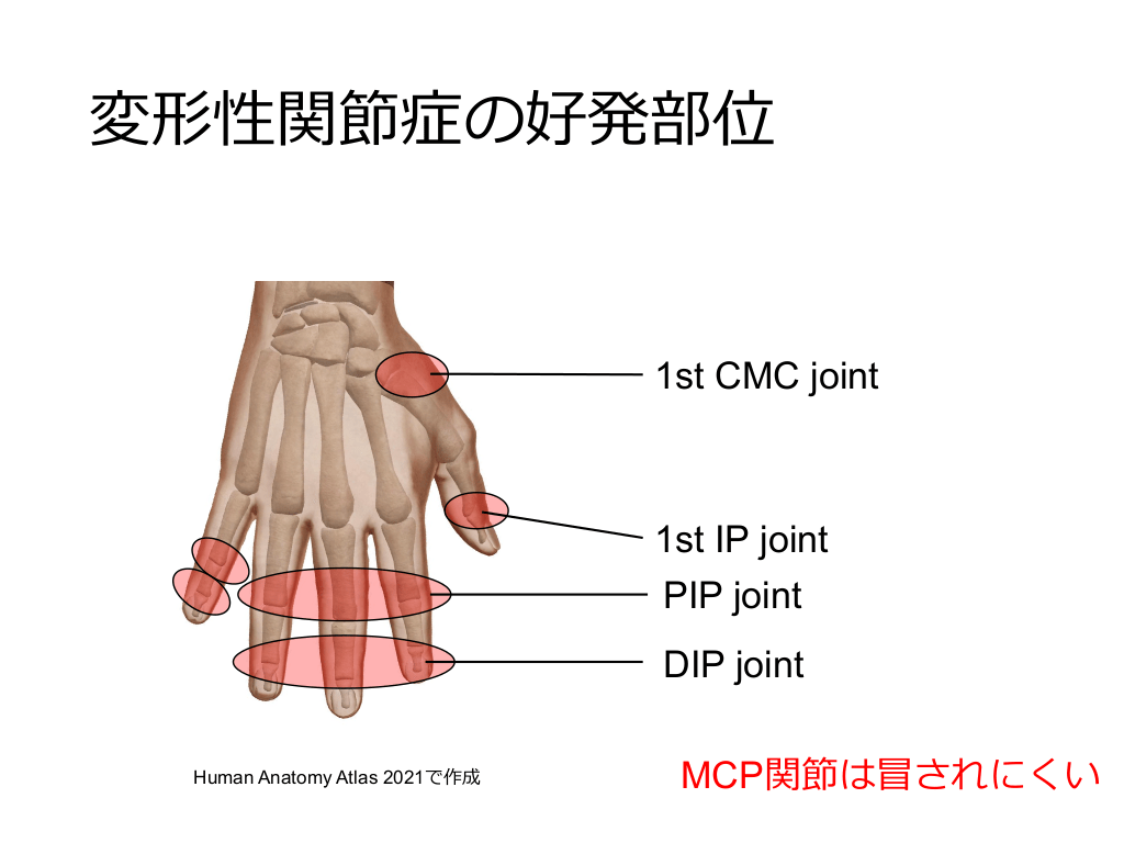 #49. 変形性関節症の好発部位 1st CMC joint 1st IP joint PIP joint DIP joint Human Anatomy Atlas 2021で作成 MCP関節は冒されにくい