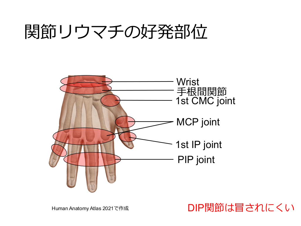 #50. 関節リウマチの好発部位 Wrist 手根間関節 1st CMC joint MCP joint 1st IP joint PIP joint Human Anatomy Atlas 2021で作成 DIP関節は冒されにくい