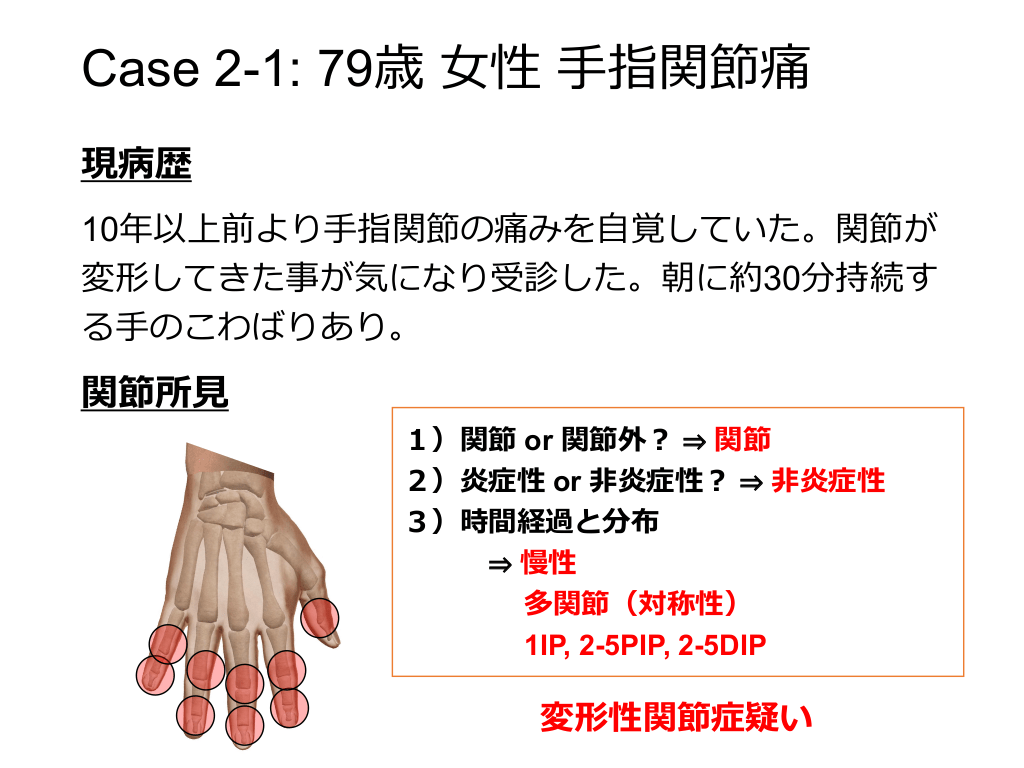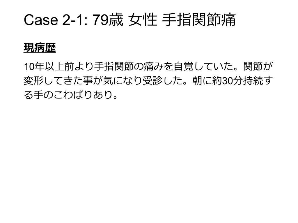 #51. Case 2-1: 79歳 女性 手指関節痛 現病歴 10年以上前より手指関節の痛みを自覚していた。関節が 変形してきた事が気になり受診した。朝に約30分持続す る手のこわばりあり。