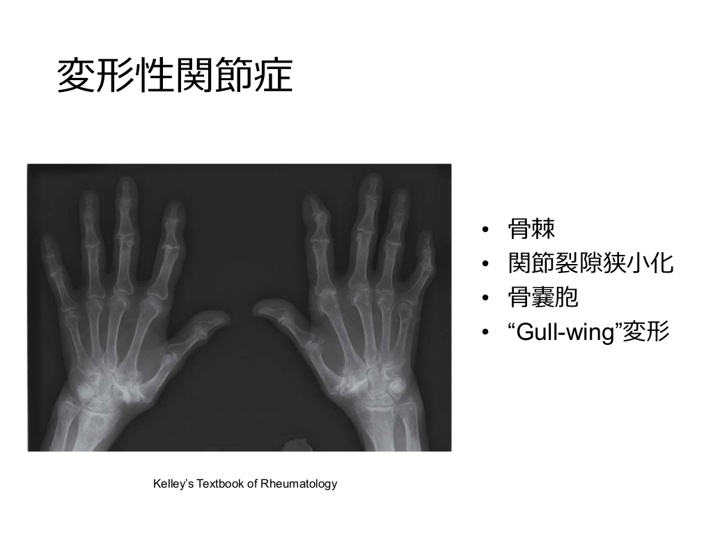 #54. 変形性関節症 • • • • Kelley’s Textbook of Rheumatology 骨棘 関節裂隙狭小化 骨嚢胞 “Gull-wing”変形