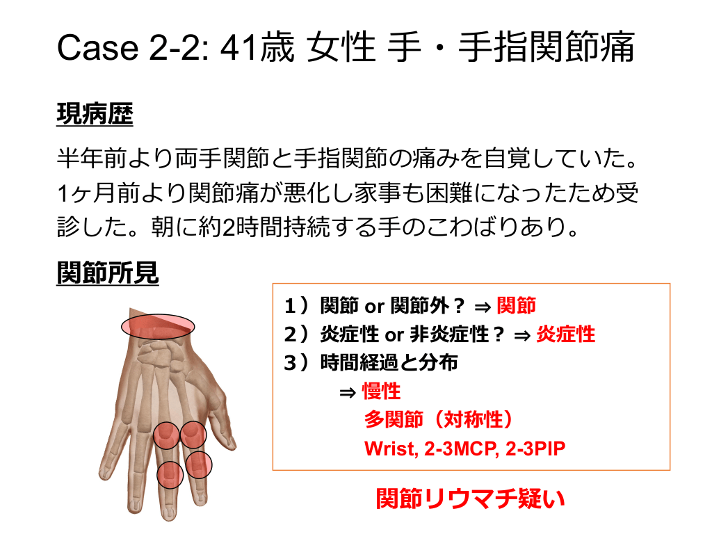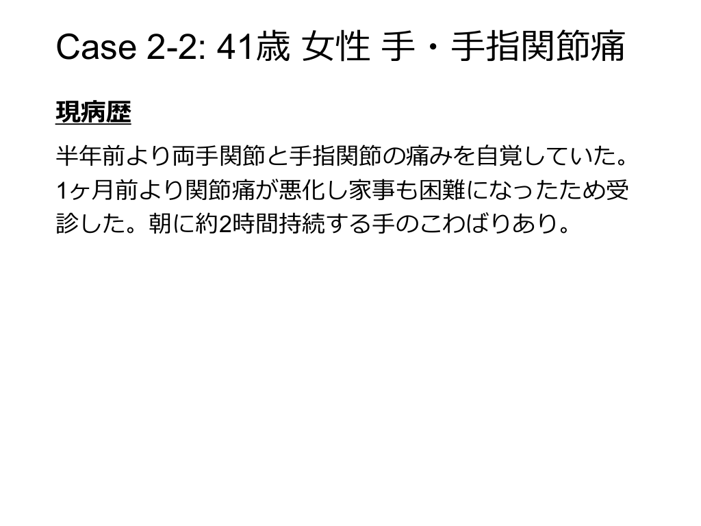 #55. Case 2-2: 41歳 女性 手・手指関節痛 現病歴 半年前より両手関節と手指関節の痛みを自覚していた。 1ヶ月前より関節痛が悪化し家事も困難になったため受 診した。朝に約2時間持続する手のこわばりあり。