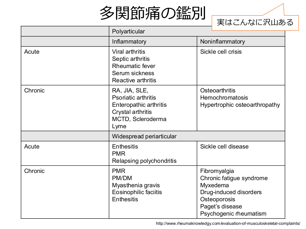 #61. 多関節痛の鑑別 実はこんなに沢山ある Polyarticular Inflammatory Noninflammatory Acute Viral arthritis Septic arthritis Rheumatic fever Serum sickness Reactive arthritis Sickle cell crisis Chronic RA, JIA, SLE, Psoriatic arthritis Enteropathic arthritis Crystal arthritis MCTD, Scleroderma Lyme Osteoarthritis Hemochromatosis Hypertrophic osteoarthropathy Widespread periarticular Acute Enthesitis PMR Relapsing polychondritis Sickle cell disease Chronic PMR PM/DM Myasthenia gravis Eosinophilic faciitis Enthesitis Fibromyalgia Chronic fatigue syndrome Myxedema Drug-induced disorders Osteoporosis Paget’s disease Psychogenic rheumatism http://www.rheumaknowledgy.com/evaluation-of-musculoskeletal-complaints/
