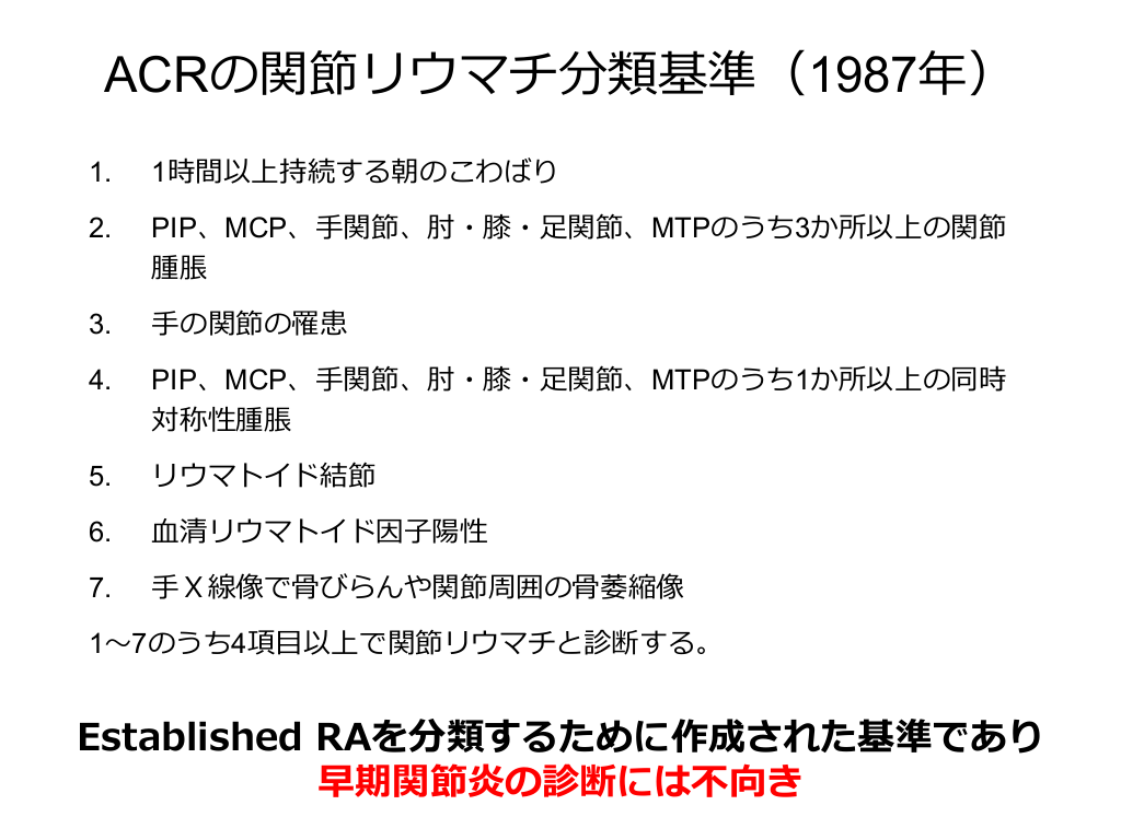 #62. ACRの関節リウマチ分類基準(1987年) 1. 1時間以上持続する朝のこわばり 2. PIP、MCP、手関節、肘・膝・足関節、MTPのうち3か所以上の関節 腫脹 3. 手の関節の罹患 4. PIP、MCP、手関節、肘・膝・足関節、MTPのうち1か所以上の同時 対称性腫脹 5. リウマトイド結節 6. 血清リウマトイド因子陽性 7. 手X線像で骨びらんや関節周囲の骨萎縮像 1~7のうち4項目以上で関節リウマチと診断する。 Established RAを分類するために作成された基準であり 早期関節炎の診断には不向き