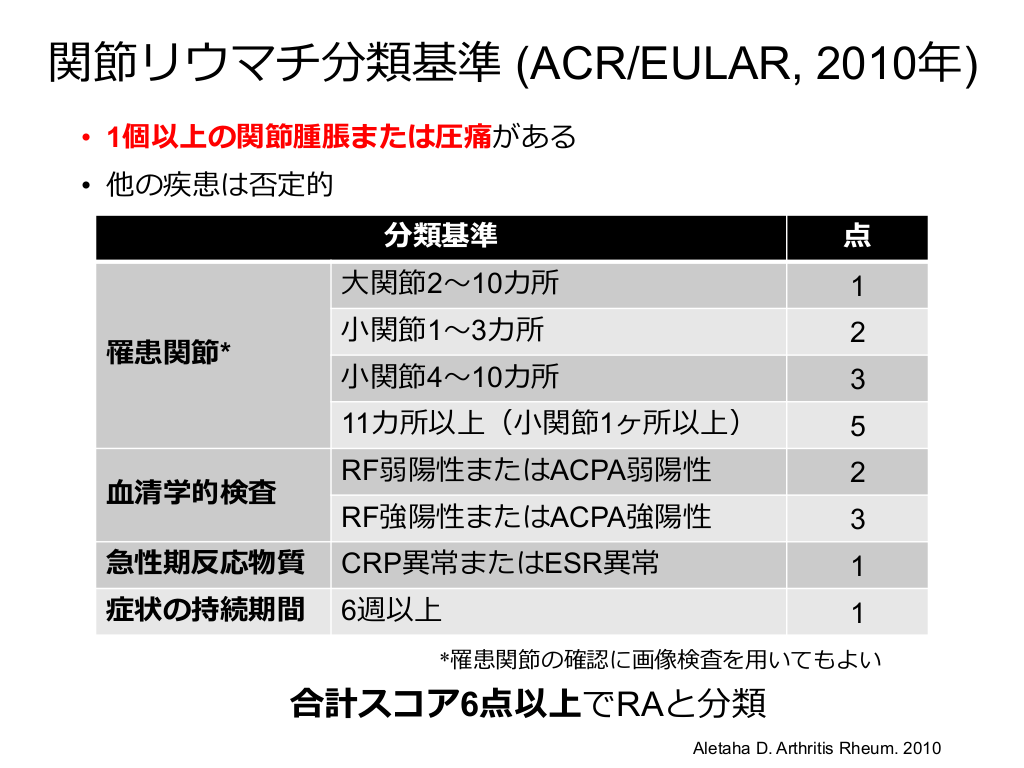 #63. 関節リウマチ分類基準 (ACR/EULAR, 2010年) • 1個以上の関節腫脹または圧痛がある • 他の疾患は否定的 分類基準 点 大関節2~10カ所 1 小関節1~3カ所 2 小関節4~10カ所 3 11カ所以上(小関節1ヶ所以上) 5 RF弱陽性またはACPA弱陽性 2 RF強陽性またはACPA強陽性 3 急性期反応物質 CRP異常またはESR異常 1 症状の持続期間 6週以上 1 罹患関節* 血清学的検査 *罹患関節の確認に画像検査を用いてもよい 合計スコア6点以上でRAと分類 Aletaha D. Arthritis Rheum. 2010