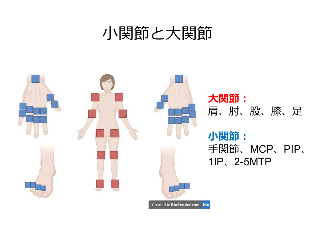 #64. 小関節と大関節 大関節: 肩、肘、股、膝、足 小関節: 手関節、MCP、PIP、 1IP、2-5MTP