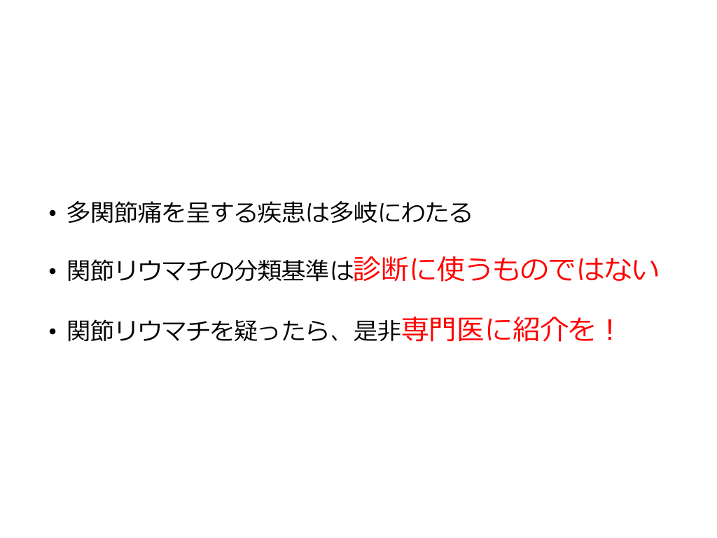 #65. • 多関節痛を呈する疾患は多岐にわたる • 関節リウマチの分類基準は診断に使うものではない • 関節リウマチを疑ったら、是非専門医に紹介を!