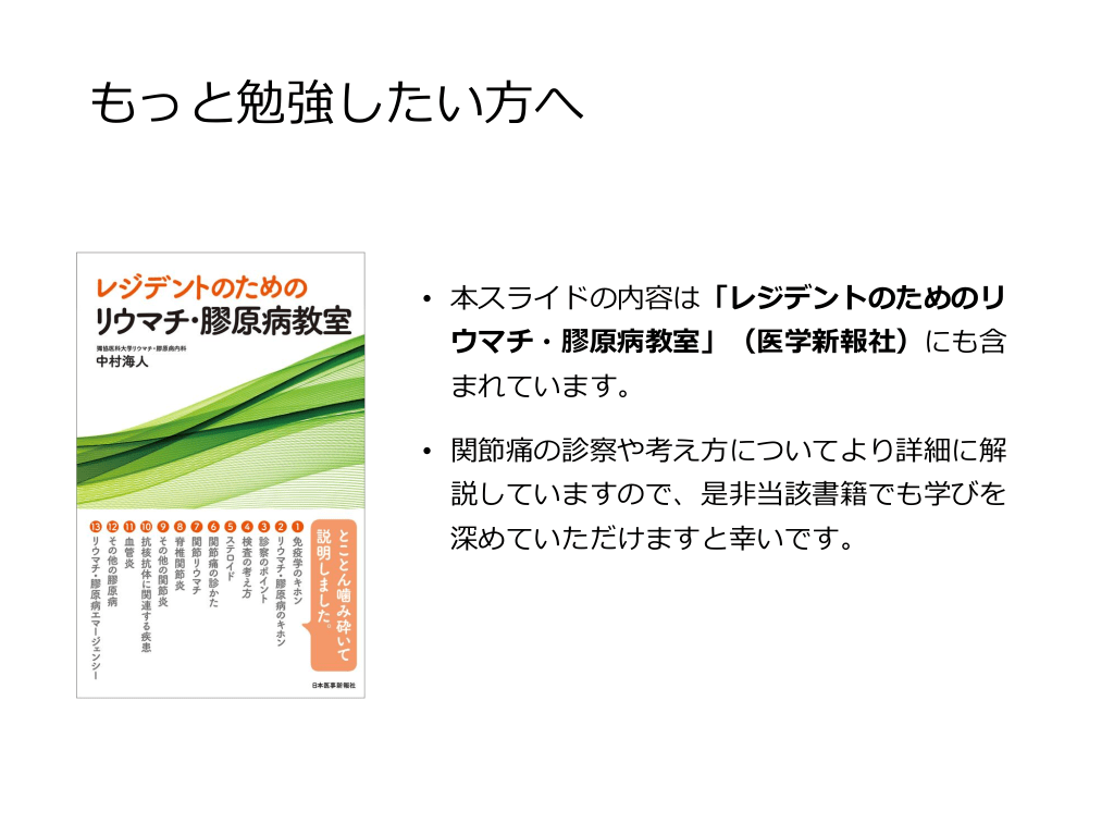 #67. もっと勉強したい方へ • 本スライドの内容は「レジデントのためのリ ウマチ・膠原病教室」(医学新報社)にも含 まれています。 • 関節痛の診察や考え方についてより詳細に解 説していますので、是非当該書籍でも学びを 深めていただけますと幸いです。