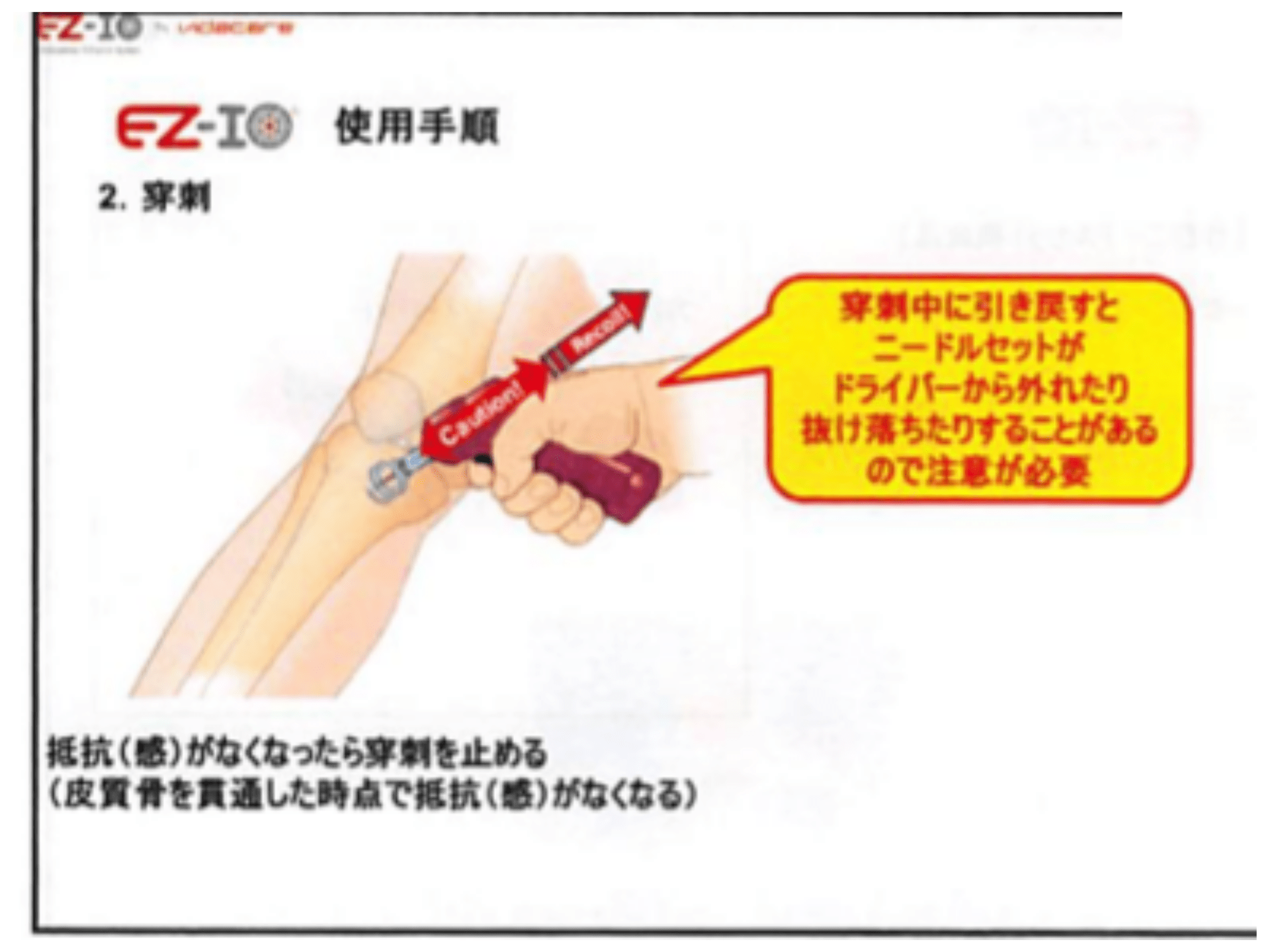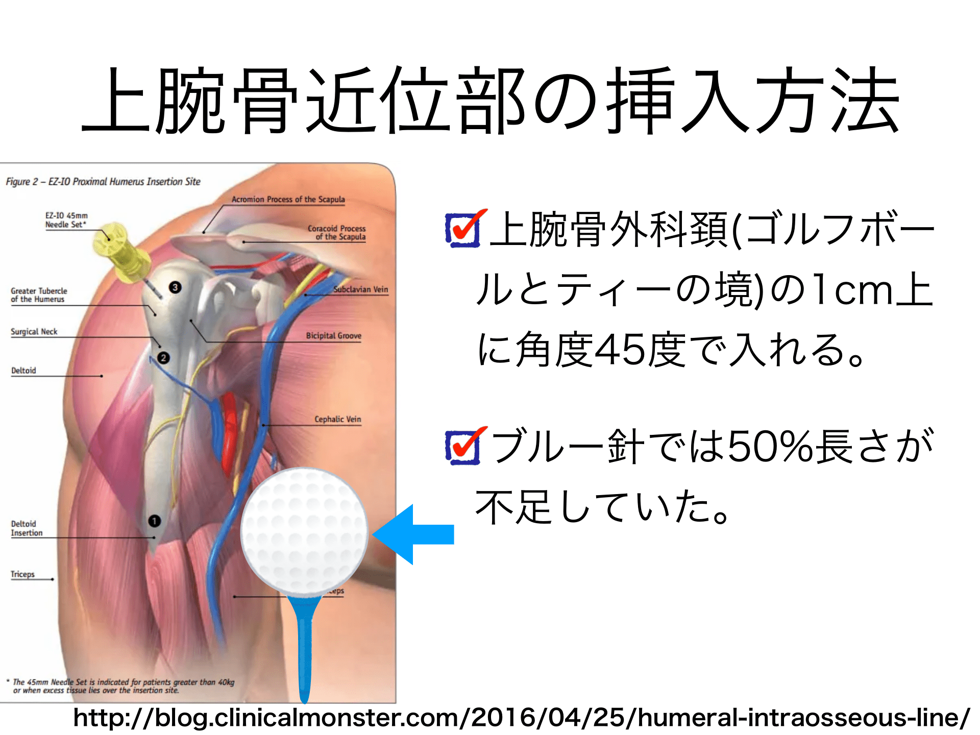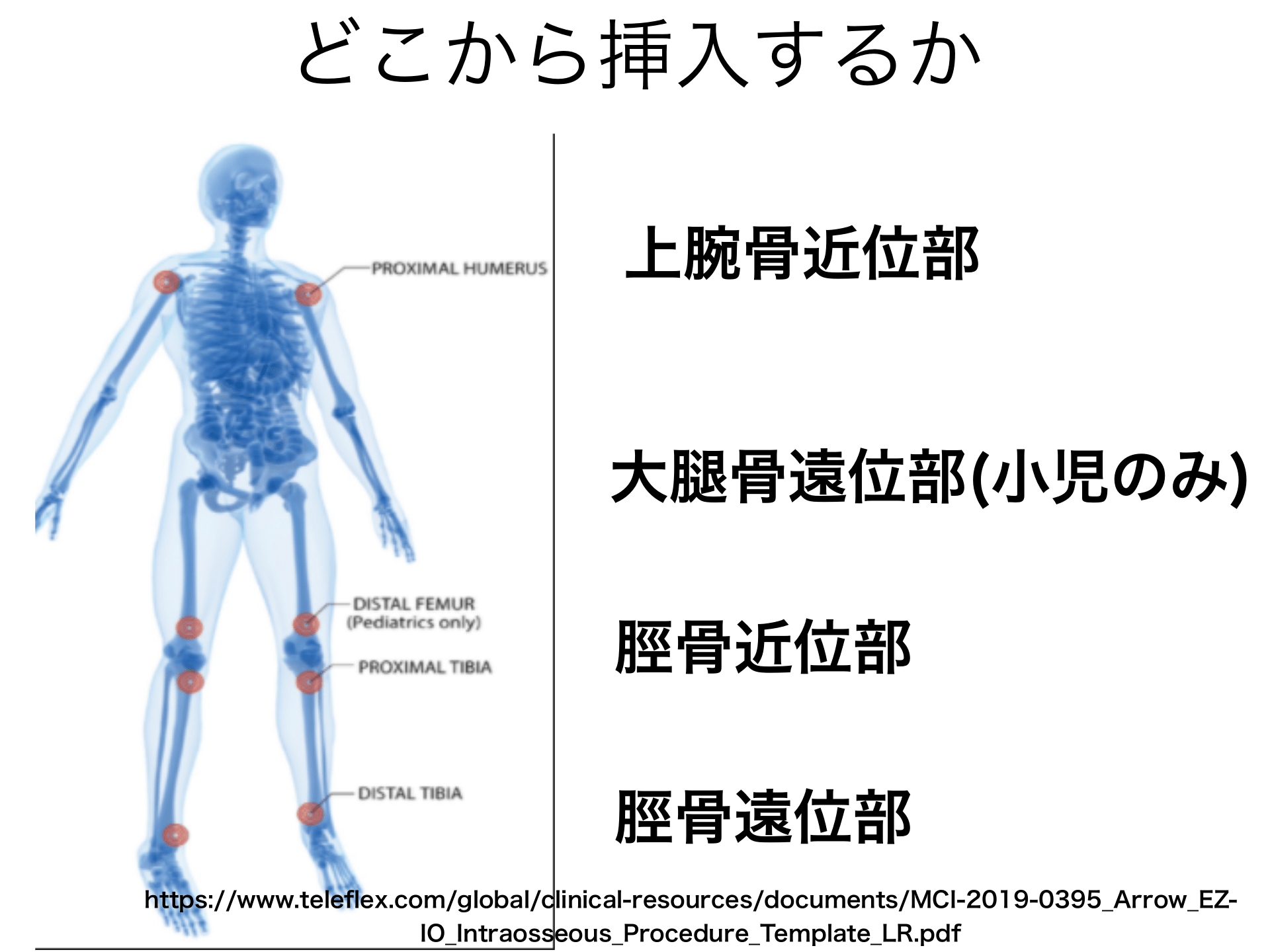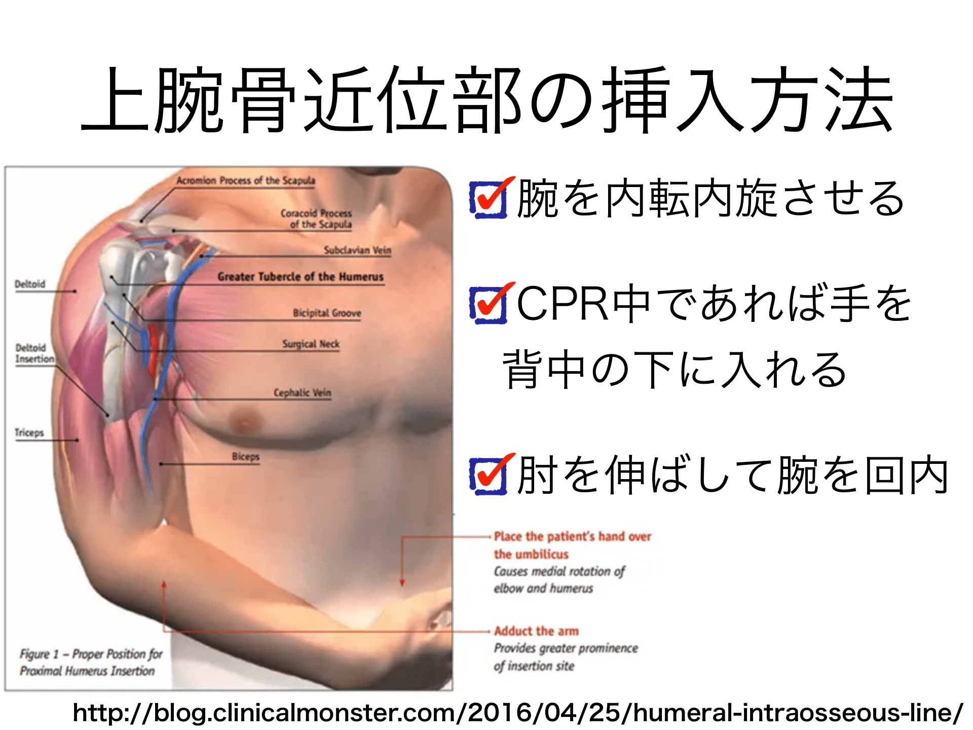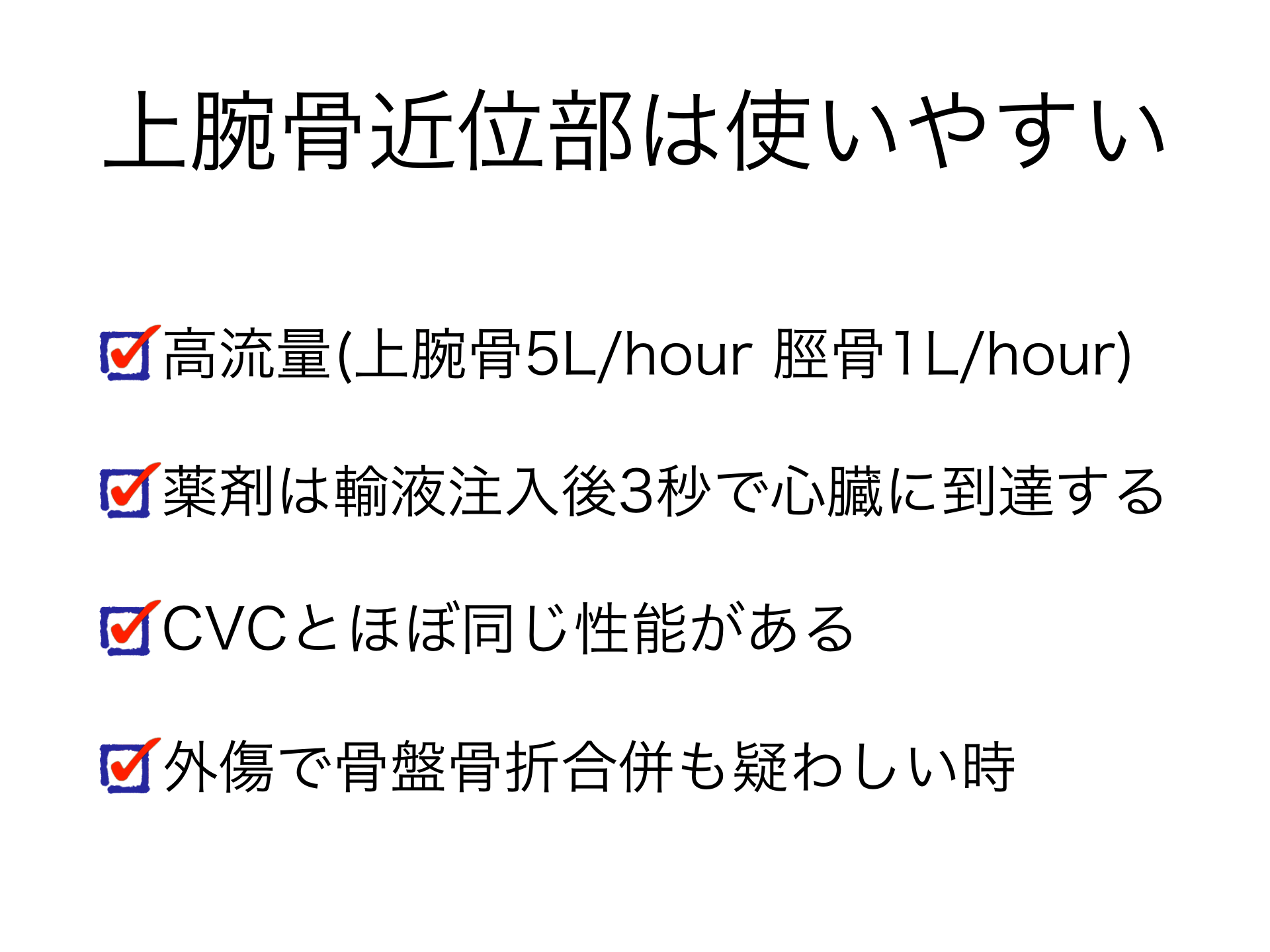 #12. 上腕骨近位部は使いやすい 高流量(上腕骨5L/hour 脛骨1L/hour) 薬剤は輸液注入後3秒で心臓に到達する CVCとほぼ同じ性能がある 外傷で骨盤骨折合併も疑わしい時