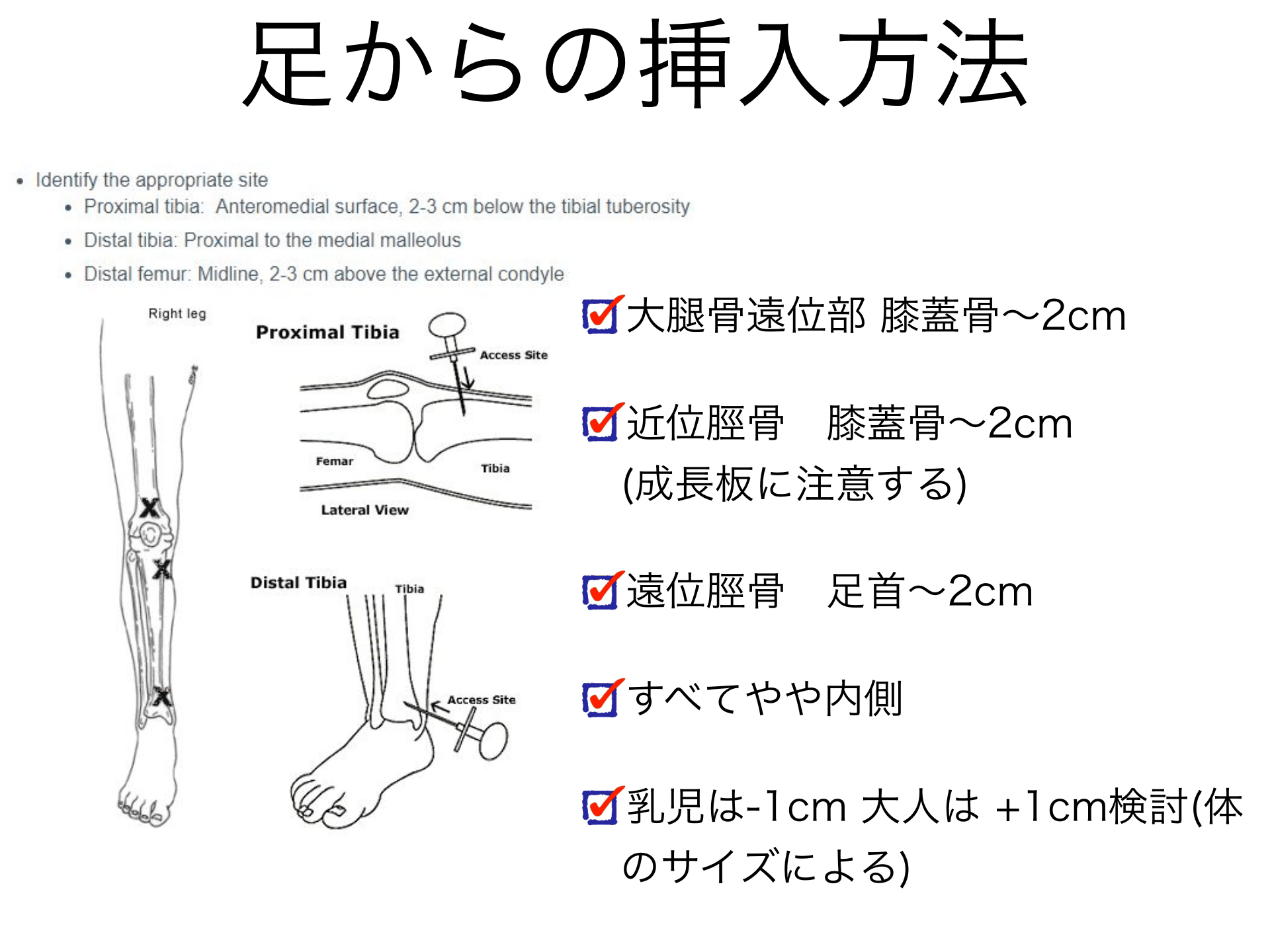 #15. 足からの挿入方法 大腿骨遠位部 膝蓋骨〜2cm 近位脛骨 膝蓋骨〜2cm 遠位脛骨 足首〜2cm (成長板に注意する) すべてやや内側 乳児は-1cm 大人は +1cm検討(体 のサイズによる)