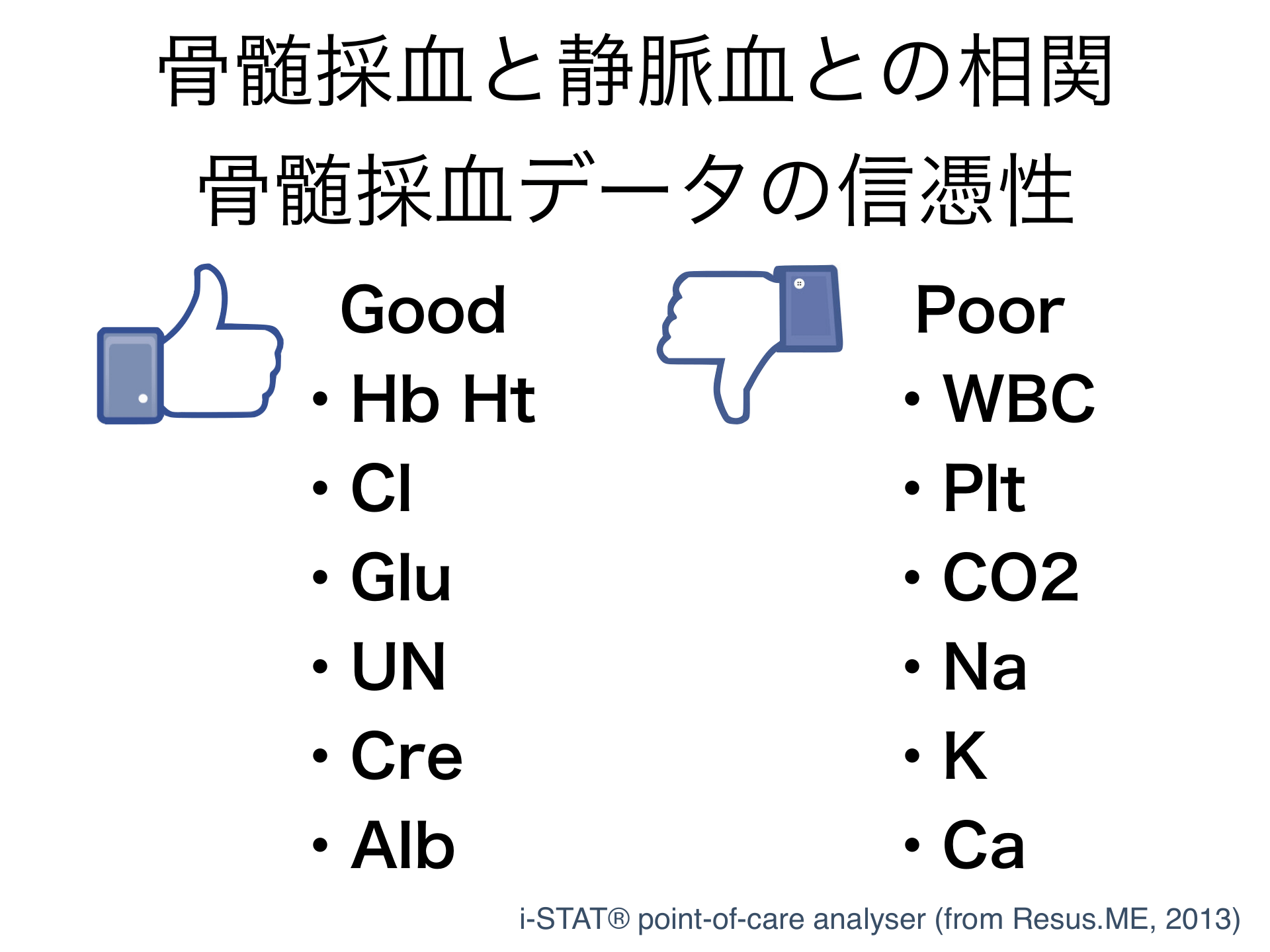 #19. 骨髄採血と静脈血との相関 骨髄採血データの信憑性 Good ・Hb Ht ・Cl ・Glu ・UN ・Cre ・Alb Poor ・WBC ・Plt ・CO2 ・Na ・K ・Ca i-STAT® point-of-care analyser (from Resus.ME, 2013)