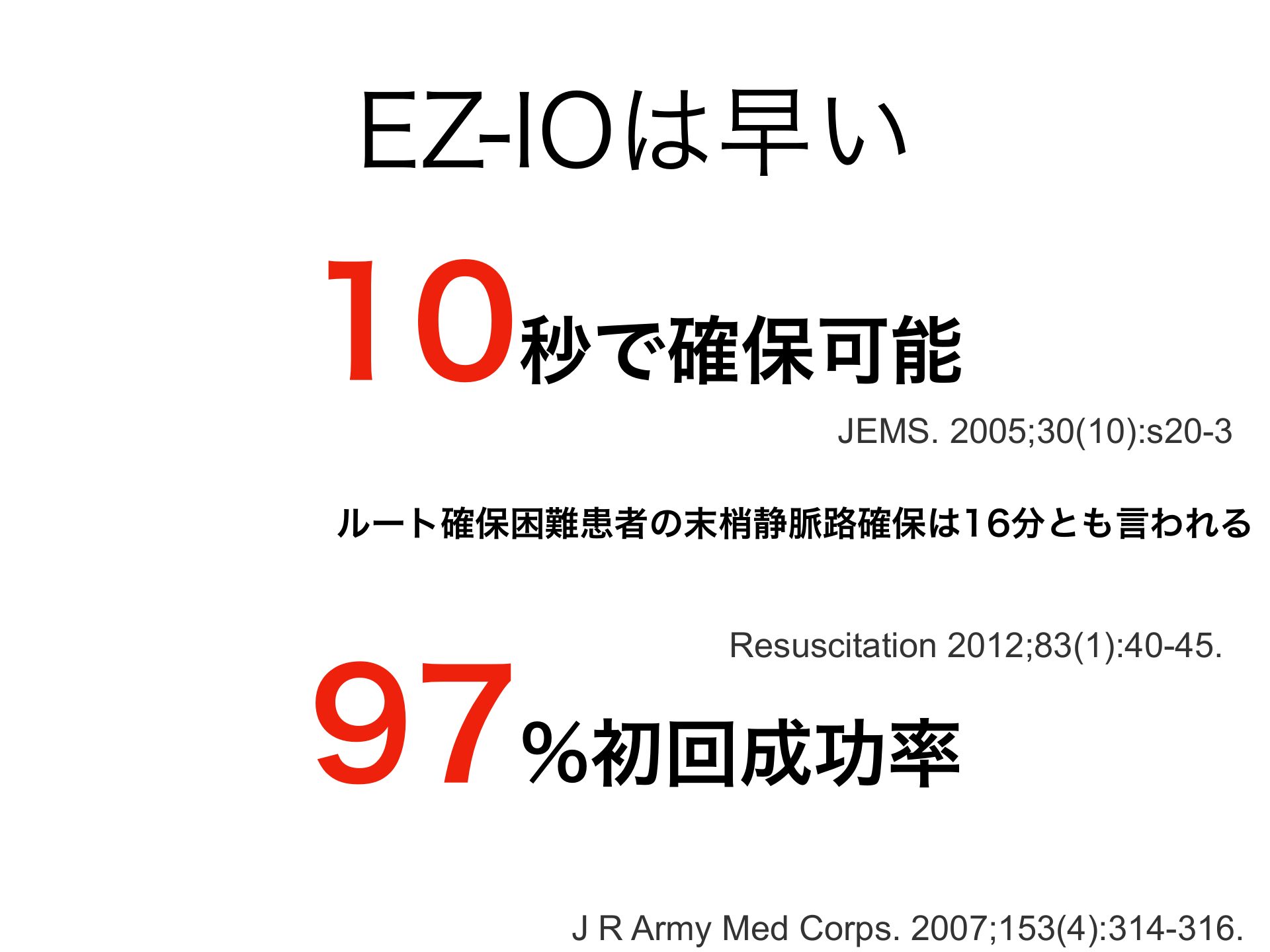 #4. EZ-IOは早い 10秒で確保可能 JEMS. 2005;30(10):s20-3 ルート確保困難患者の末梢静脈路確保は16分とも言われる 97%初回成功率 Resuscitation 2012;83(1):40-45. J R Army Med Corps. 2007;153(4):314-316.