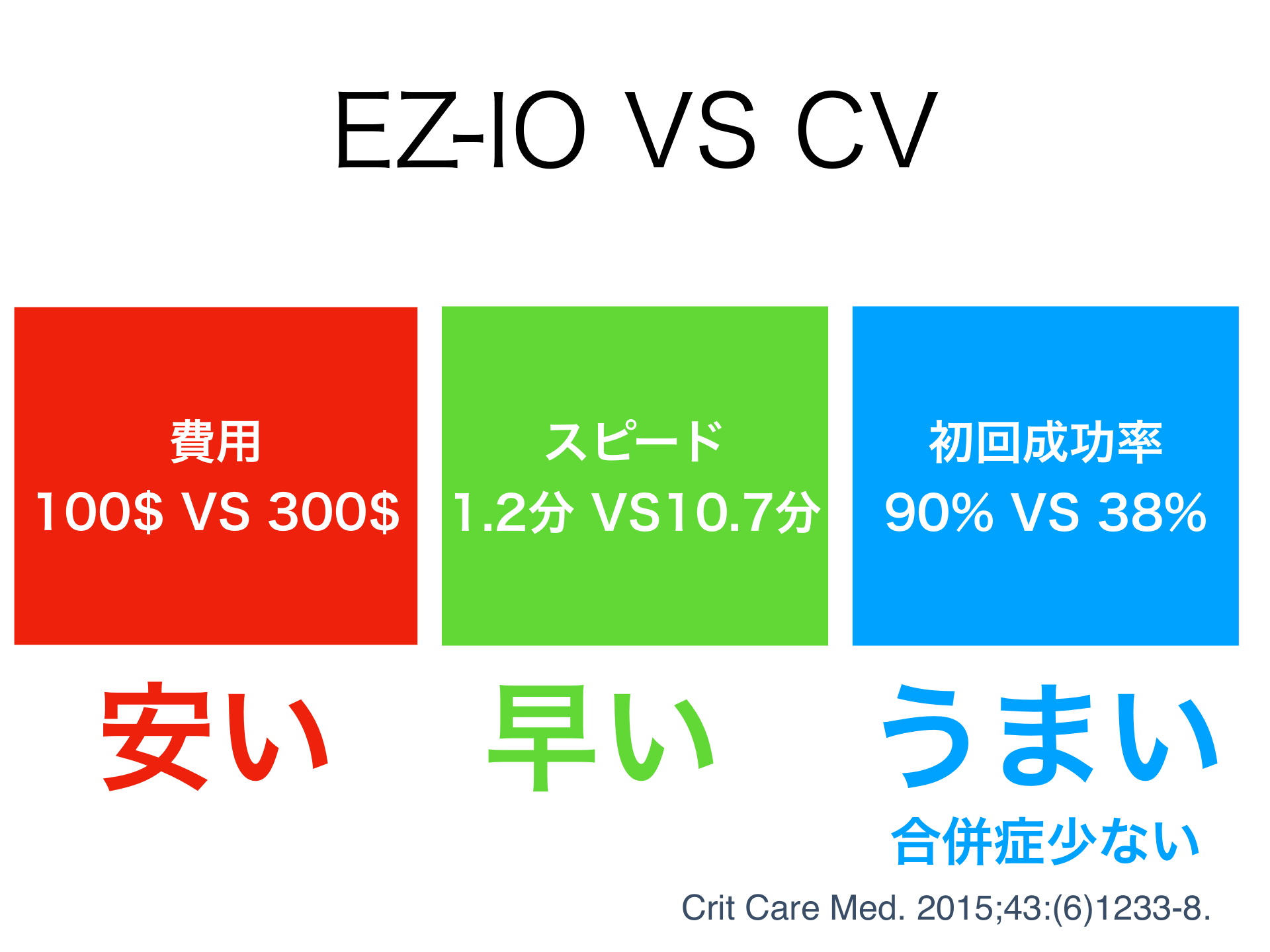 #5. EZ-IO VS CV 費用 スピード 100$ VS 300$ 1.2分 VS10.7分 安い 早い 初回成功率 90% VS 38% うまい 合併症少ない Crit Care Med. 2015;43:(6)1233-8.