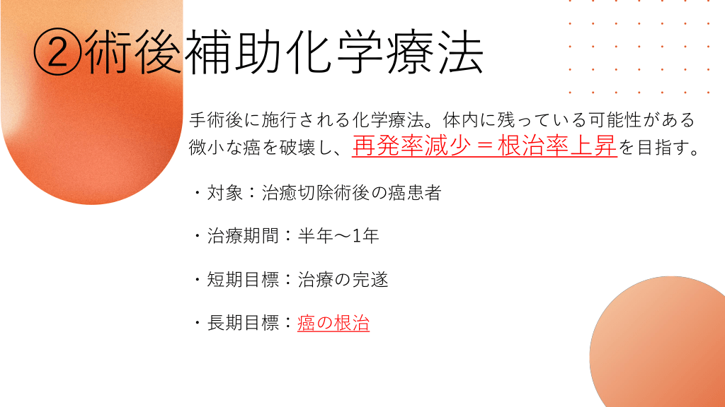 #10. ②術後補助化学療法 手術後に施行される化学療法。体内に残っている可能性がある 微小な癌を破壊し、再発率減少=根治率上昇を目指す。 ・対象:治癒切除術後の癌患者 ・治療期間:半年~1年 ・短期目標:治療の完遂 ・長期目標:癌の根治
