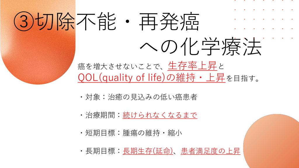 #11. ③切除不能・再発癌 への化学療法 癌を増大させないことで、生存率上昇と QOL(quality of life)の維持・上昇を目指す。 ・対象:治癒の見込みの低い癌患者 ・治療期間:続けられなくなるまで ・短期目標:腫瘍の維持・縮小 ・長期目標:長期生存(延命)、患者満足度の上昇