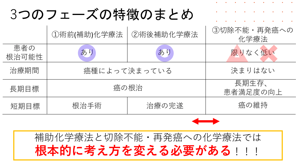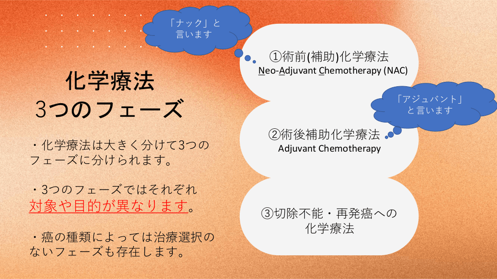 #7. 「ナック」と 言います ①術前(補助)化学療法 化学療法 3つのフェーズ ・化学療法は大きく分けて3つの フェーズに分けられます。 ・3つのフェーズではそれぞれ 対象や目的が異なります。 ・癌の種類によっては治療選択の ないフェーズも存在します。 Neo-Adjuvant Chemotherapy (NAC) 「アジュバント」 と言います ②術後補助化学療法 Adjuvant Chemotherapy ③切除不能・再発癌への 化学療法