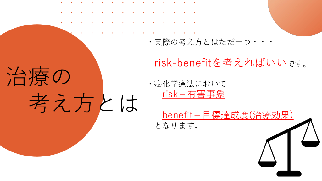 #13. ・実際の考え方とはただ一つ・・・ 治療の 考え方とは risk-benefitを考えればいいです。 ・癌化学療法において risk=有害事象 benefit=目標達成度(治療効果) となります。