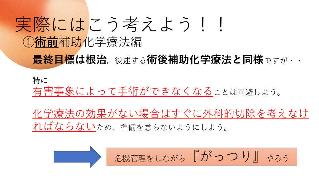 #14. 実際にはこう考えよう!! ①術前補助化学療法編 最終目標は根治。後述する術後補助化学療法と同様ですが・・ 特に 有害事象によって手術ができなくなることは回避しよう。 化学療法の効果がない場合はすぐに外科的切除を考えなけ ればならないため、準備を怠らないようにしよう。 危機管理をしながら 『がっつり』やろう
