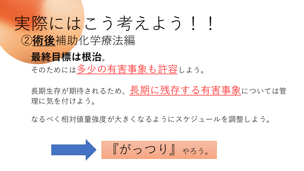 #15. 実際にはこう考えよう!! ②術後補助化学療法編 最終目標は根治。 そのためには多少の有害事象も許容しよう。 長期生存が期待されるため、長期に残存する有害事象については管 理に気を付けよう。 なるべく相対値量強度が大きくなるようにスケジュールを調整しよう。 『がっつり』やろう。