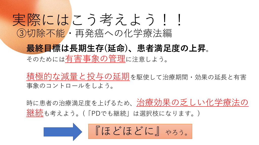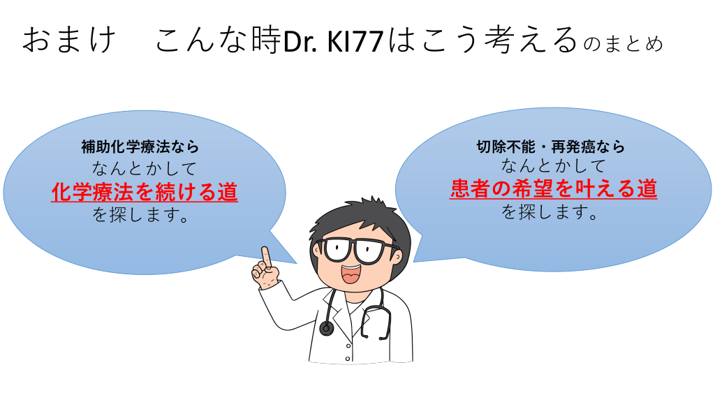 #21. おまけ こんな時Dr. KI77はこう考えるのまとめ 補助化学療法なら 切除不能・再発癌なら なんとかして なんとかして 化学療法を続ける道 患者の希望を叶える道 を探します。 を探します。
